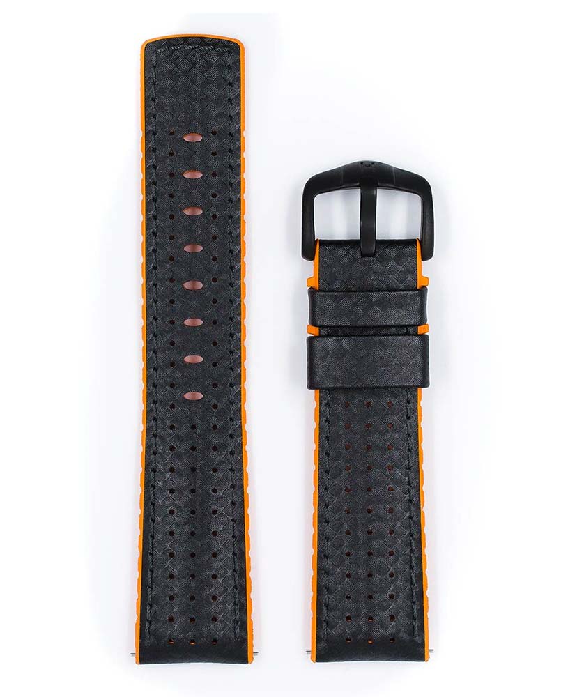 Hirsch Ayrton je extrémně odolný řemínek pro sportovní hodinky. Kombinace černé na svršku, kožené části, která je velmi odolná a má karbonový vzor s oranžovým spodkem z nejkvalitnější gumy Hirsch Premium Caoutchouc . Tato kombinace umožňuje plavání s pásem Hirsch Ayrton bez jakýchkoliv překážek a speciální drážky na dně odvádějí vodu a vlhkost a zajišťují nejvyšší komfort nošení. Matně černá spona z nerezové oceli a široké volné poutko na opasek dodávají modelu Hirsch Ayrton mužný, sportovní charakter. Značka Hirsch používá ve svých produktech Quick-Release System , jedná se o speciální teleskopy, které usnadňují nasazení řemínku bez použití nářadí a pomoci hodináře. Stačí posunout jazýčky na dalekohledech a řemínek lze vložit do pouzdra hodinek.