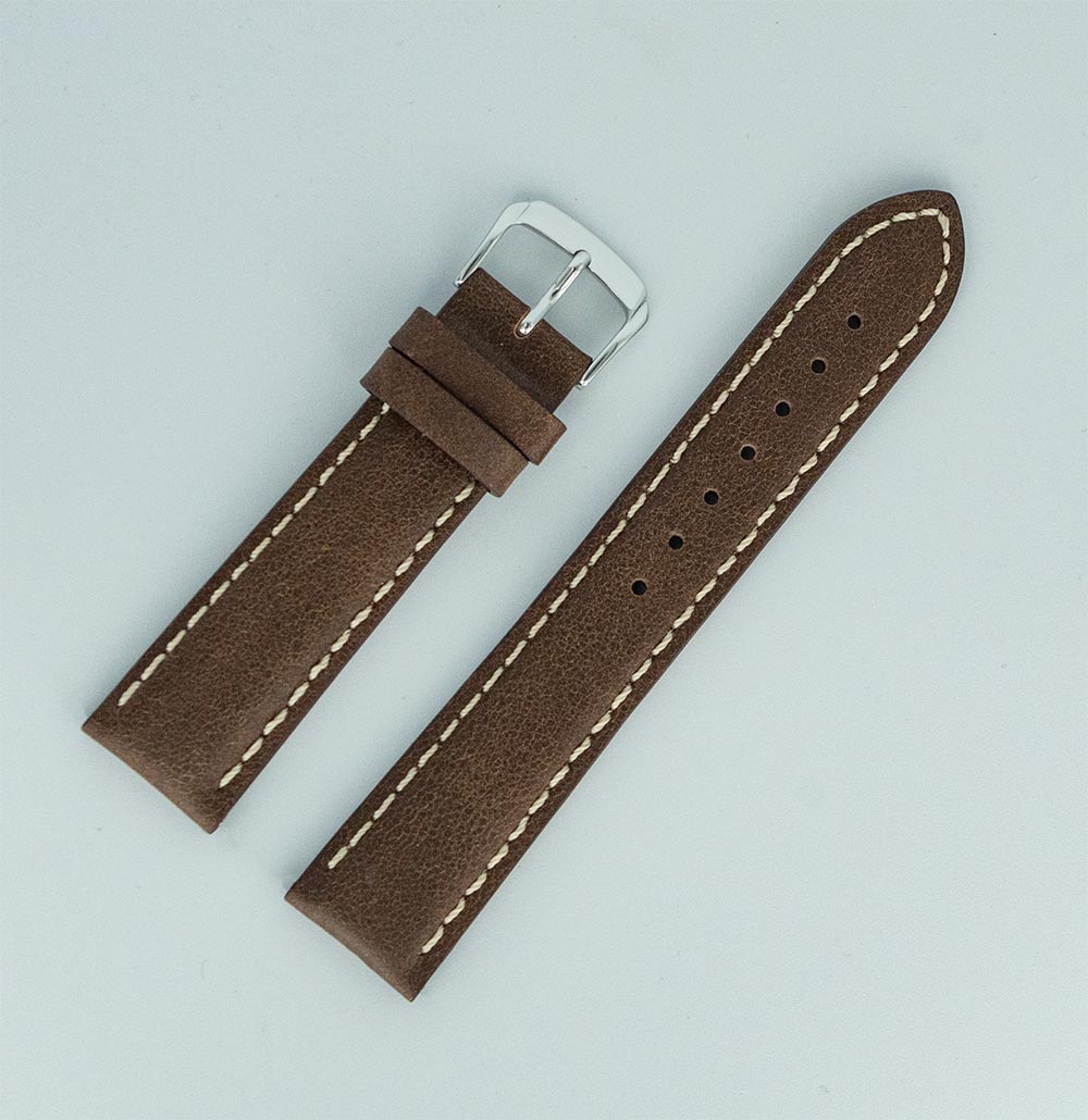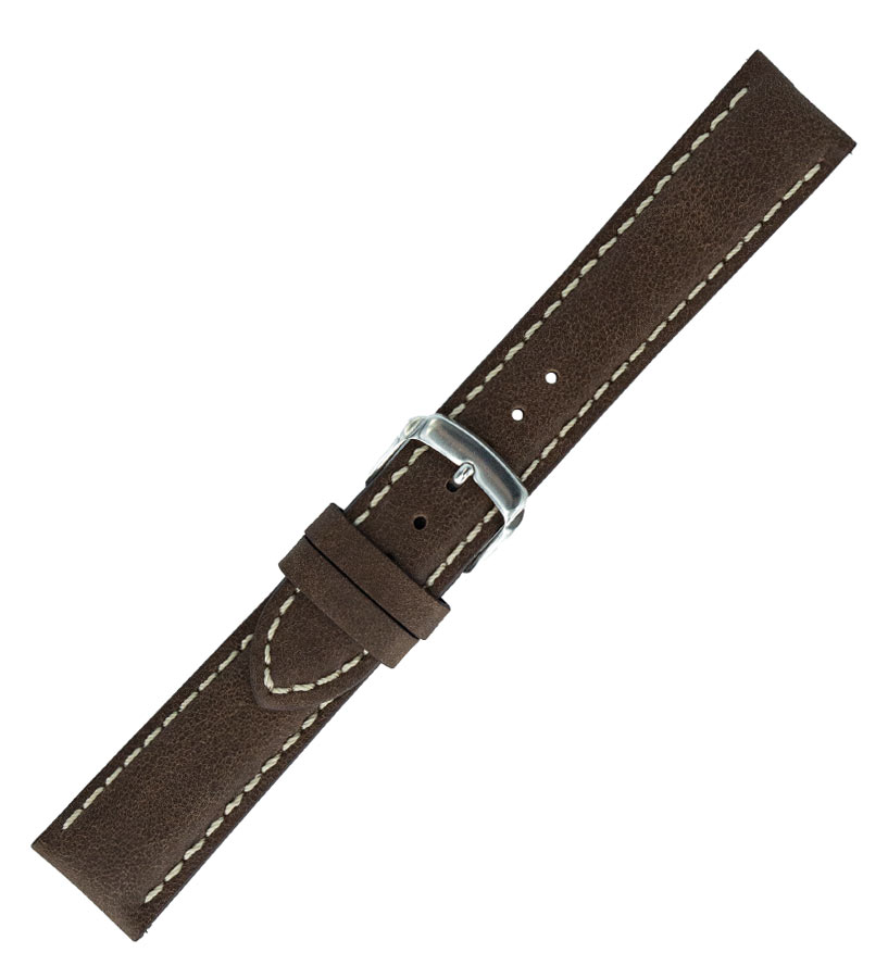Hirsch Calfskin Stitched hnědý řemínek hodinek s bílou nití v retro stylu. Vyrobeno z měkké a pohodlné přírodní kůže s heterogenní strukturou, která dodává vintage styl. Univerzální a nadčasový design z tohoto modelu dělá perfektní doplněk k pánským hodinkám.