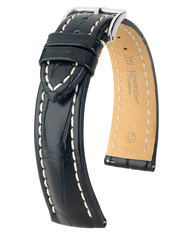 Exkluzivní řemínek k hodinkám z aligátoří kůže v polomatné barvě Hirsch Capitano černá . Elegantní a sportovní zároveň. Tvar řemínku poskytuje silný a atletický charakter, který se bude ideálně hodit k masivním sportovním hodinkám jako Breitling, Panerai nebo Omega . Perfektní společník pro objemné hodinky. Vyrobeno z nejkvalitnější louisianské aligátoří kůže, dodává hmatatelnou sílu.
