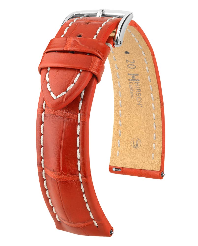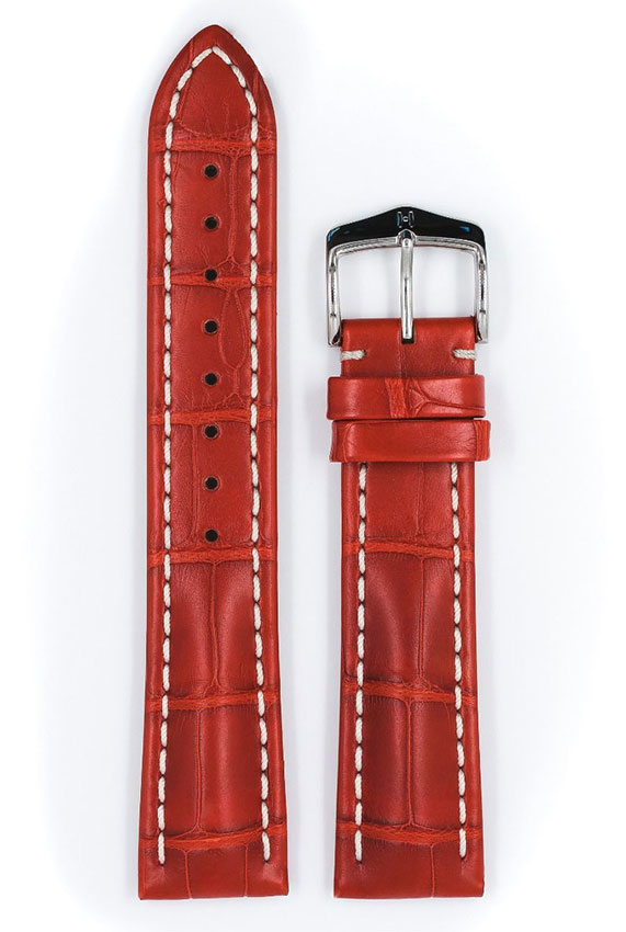 Exkluzivní řemínek k hodinkám z aligátoří kůže v polomatné červené barvě Hirsch Capitano . Elegantní a sportovní zároveň. Tvar řemínku poskytuje silný a atletický charakter, který se bude ideálně hodit k masivním sportovním hodinkám jako Breitling, Panerai nebo Omega . Perfektní společník pro objemné hodinky. Vyrobeno z nejkvalitnější louisianské aligátoří kůže, dodává hmatatelnou sílu.