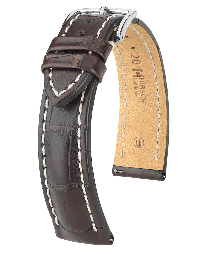 Exkluzivní řemínek k hodinkám z aligátoří kůže v polomatné hnědé barvě Hirsch Capitano . Elegantní a sportovní zároveň. Tvar řemínku poskytuje silný a atletický charakter, který bude perfektní pro masivní sportovní hodinky jako Breitling, Panerai nebo Omega . Perfektní společník pro objemné hodinky. Vyrobeno z nejkvalitnější louisianské aligátoří kůže, dodává hmatatelnou sílu.