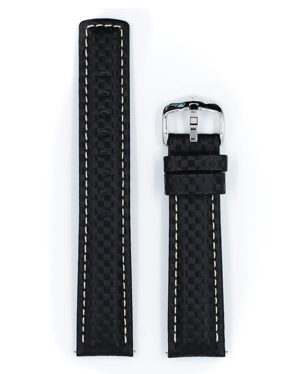 Černý řemínek k hodinkám Hirsch Carbon. Speciální high-tech kůže jako výsledek výzkumu HIRSCH se sportovním čtvercovým polstrováním a výrazným kontrastním prošíváním. V kombinaci s pryžovým podšívkovým materiálem je výsledkem funkčnost produktu HIRSCH 100m Water-Resistant. Podobné materiály se používají v kosmickém průmyslu. Vodotěsný popruh je ideální pro plavání.