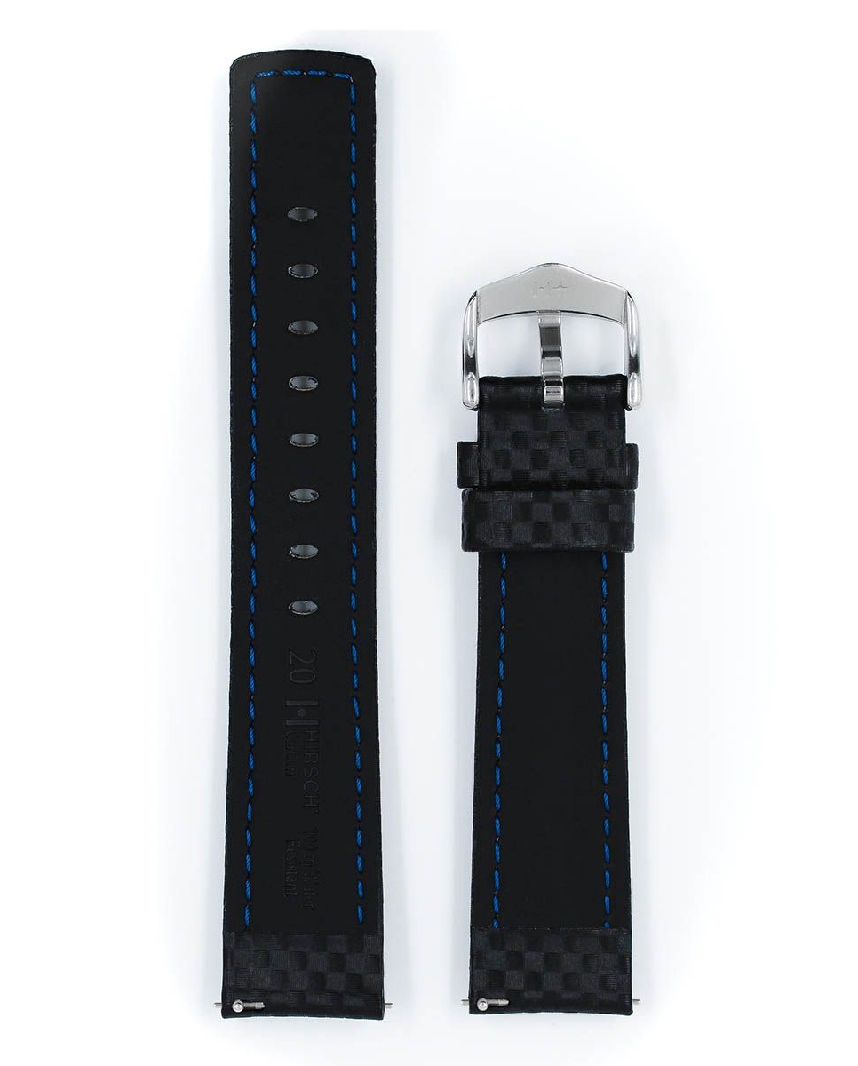 Černý řemínek k hodinkám Hirsch Carbon. Speciální high-tech kůže jako výsledek výzkumu HIRSCH se sportovním čtvercovým polstrováním a výrazným kontrastním prošíváním. V kombinaci s pryžovým podšívkovým materiálem je výsledkem funkčnost produktu HIRSCH 100m Water-Resistant. Podobné materiály se používají v kosmickém průmyslu. Vodotěsný popruh je ideální pro plavání.