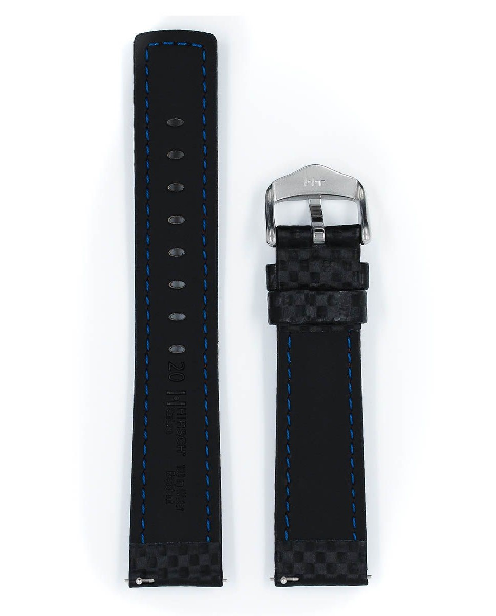 Řemínek k hodinkám Hirsch Carbon černý s červenou nití. Speciální high-tech kůže jako výsledek výzkumu HIRSCH se sportovním čtvercovým polstrováním a výrazným kontrastním prošíváním. V kombinaci s pryžovým podšívkovým materiálem je výsledkem funkčnost produktu HIRSCH 100m Water-Resistant. Podobné materiály se používají v kosmickém průmyslu. Vodotěsný popruh je ideální pro plavání.