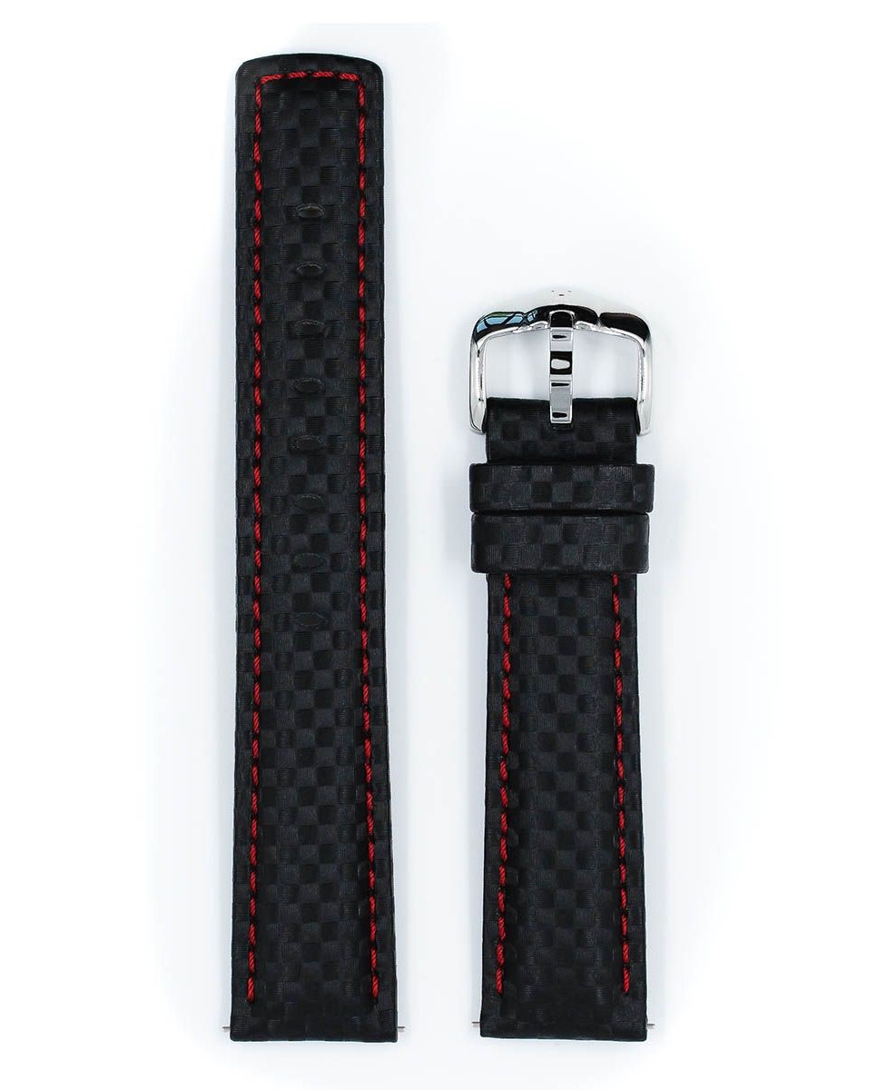 Řemínek k hodinkám Hirsch Carbon černý s červenou nití. Speciální high-tech kůže jako výsledek výzkumu HIRSCH se sportovním čtvercovým polstrováním a výrazným kontrastním prošíváním. V kombinaci s pryžovým podšívkovým materiálem je výsledkem funkčnost produktu HIRSCH 100m Water-Resistant. Podobné materiály se používají v kosmickém průmyslu. Vodotěsný popruh je ideální pro plavání.