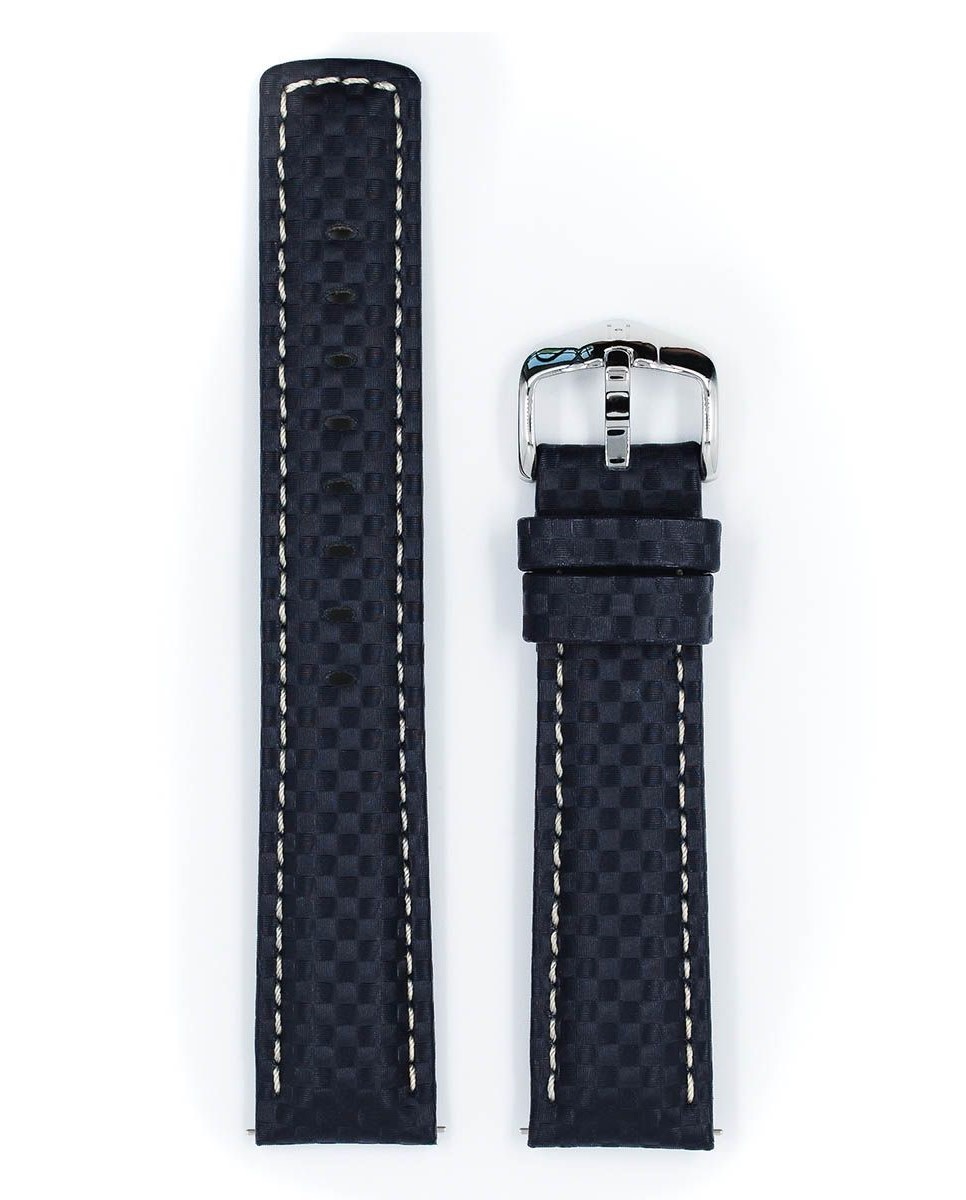 Modrý řemínek k hodinkám Hirsch Carbon. Speciální high-tech kůže jako výsledek výzkumu HIRSCH se sportovním čtvercovým polstrováním a výrazným kontrastním prošíváním. V kombinaci s pryžovým podšívkovým materiálem je výsledkem funkčnost produktu HIRSCH 100m Water-Resistant. Podobné materiály se používají v kosmickém průmyslu. Vodotěsný popruh je ideální pro plavání.