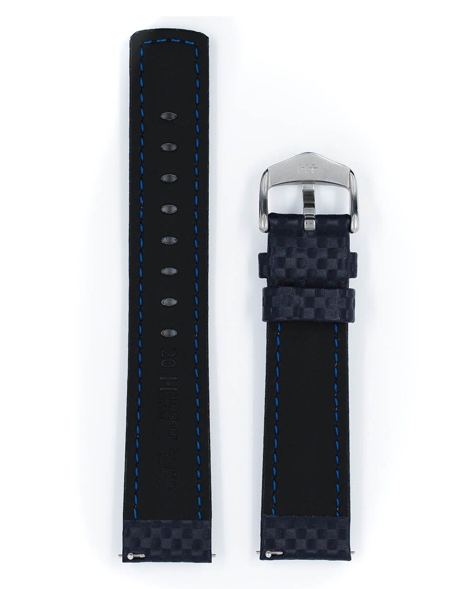 Modrý řemínek k hodinkám Hirsch Carbon. Speciální high-tech kůže jako výsledek výzkumu HIRSCH se sportovním čtvercovým polstrováním a výrazným kontrastním prošíváním. V kombinaci s pryžovým podšívkovým materiálem je výsledkem funkčnost produktu HIRSCH 100m Water-Resistant. Podobné materiály se používají v kosmickém průmyslu. Vodotěsný popruh je ideální pro plavání.