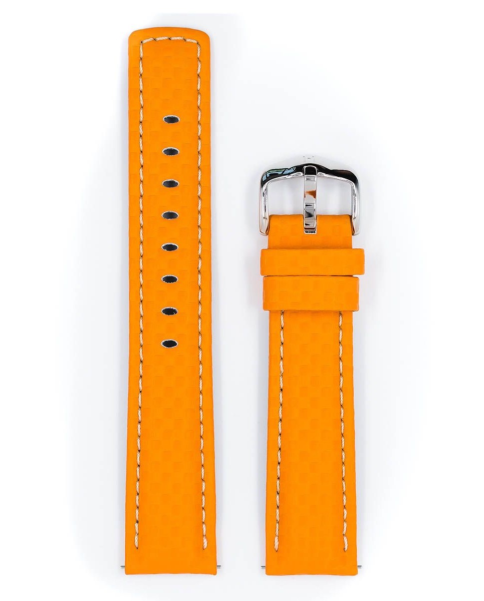 Řemínek na hodinky Hirsch Carbon oranžový. Speciální high-tech kůže jako výsledek výzkumu HIRSCH se sportovním čtvercovým polstrováním a výrazným kontrastním prošíváním. V kombinaci s pryžovým podšívkovým materiálem je výsledkem funkčnost produktu HIRSCH 100m Water-Resistant. Podobné materiály se používají v kosmickém průmyslu. Vodotěsný popruh je ideální pro plavání.