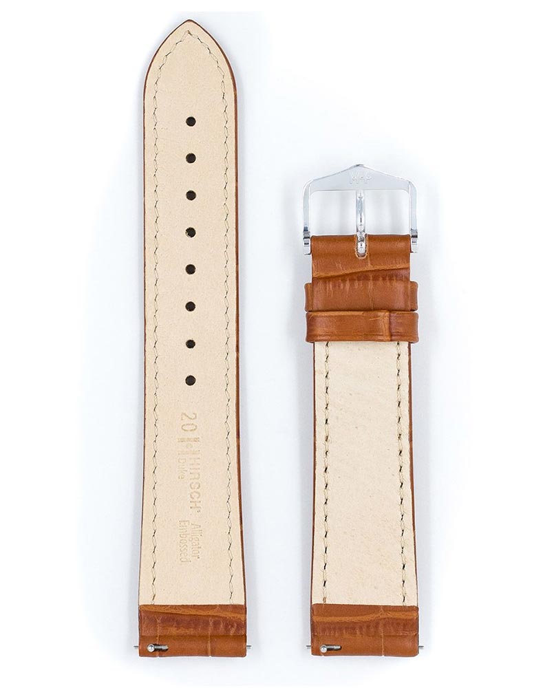 Jeden z celosvětově nejoblíbenějších řemínků k hodinkám Hirsch Duke ve světle hnědé, medové barvě. Rakouský výrobce po staletí zdokonaluje řemeslné zpracování kůže a výsledkem je výjimečně odolná přírodní kůže, která kombinuje elegantní a exkluzivní vzor aligátora s extrémní odolností. Vodě a potu odolná podšívka Hirsch Softglove zajišťuje nejvyšší komfort nošení i při vyšší zátěži. Teleskopy Hirsch Quick-Release upevněné v řemínku umožňují jeho připevnění k hodinkám bez použití nářadí. Model Duke se skvěle hodí k elegantním i sportovním hodinkám. Světle hnědý medově hnědý řemínek k hodinkám Hirsch Duke je dostupný v následujících šířkách: 14 mm, 16 mm, 18 mm, 20 mm, 22 mm.