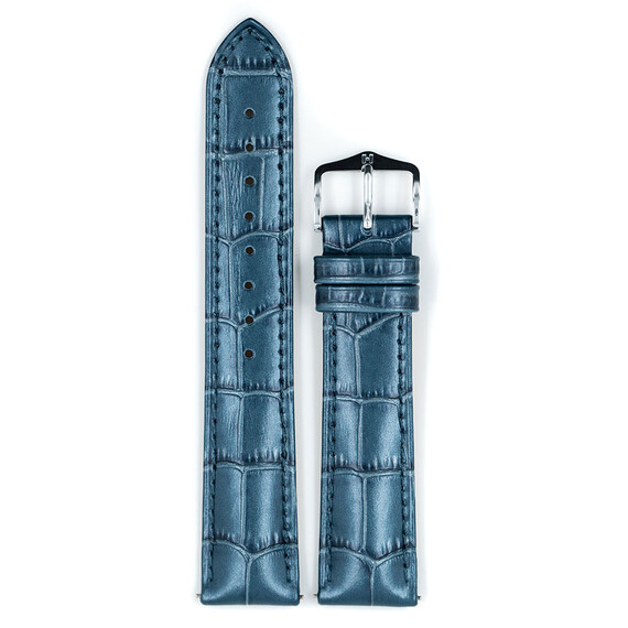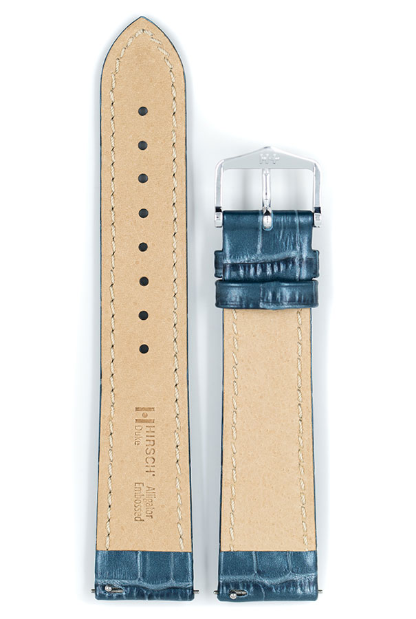 Limitovaná edice kovového dámského řemínku k hodinkám Hirsch Duke . Nejjemnější italská teletina v modré barvě s přirozeně vypadající embosováním aligátora. Polomatný povrch s charakteristickým dvoubarevným odstínem. Kovové provedení je ideální pro dámské lesklé nebo zlaté hodinky. Vodě a potu odolná podšívka Hirsch Softglove zajišťuje nejvyšší komfort nošení i při vyšší zátěži. Tento řemínek k hodinkám je vybaven teleskopy Hirsch Quick-Release , které umožňují nasazení bez použití nářadí.