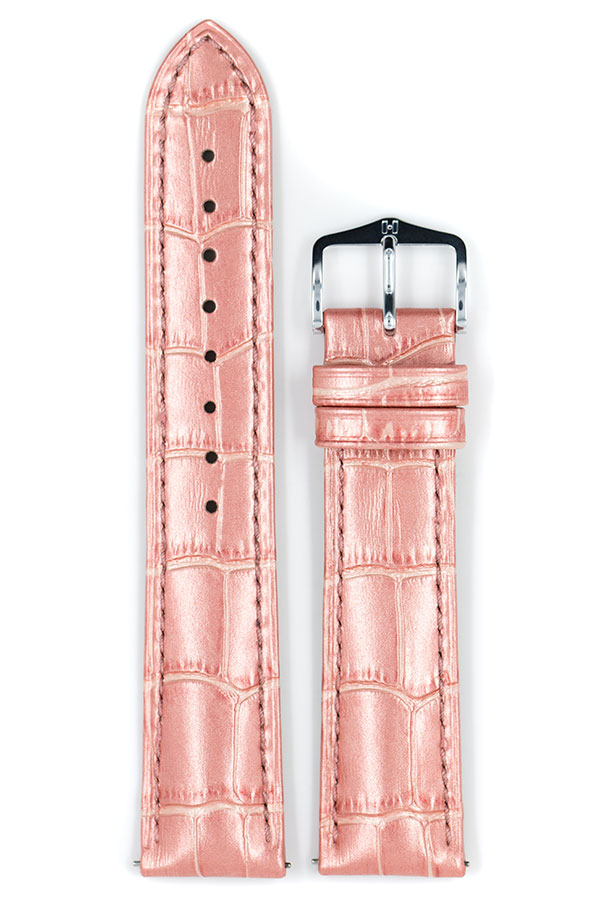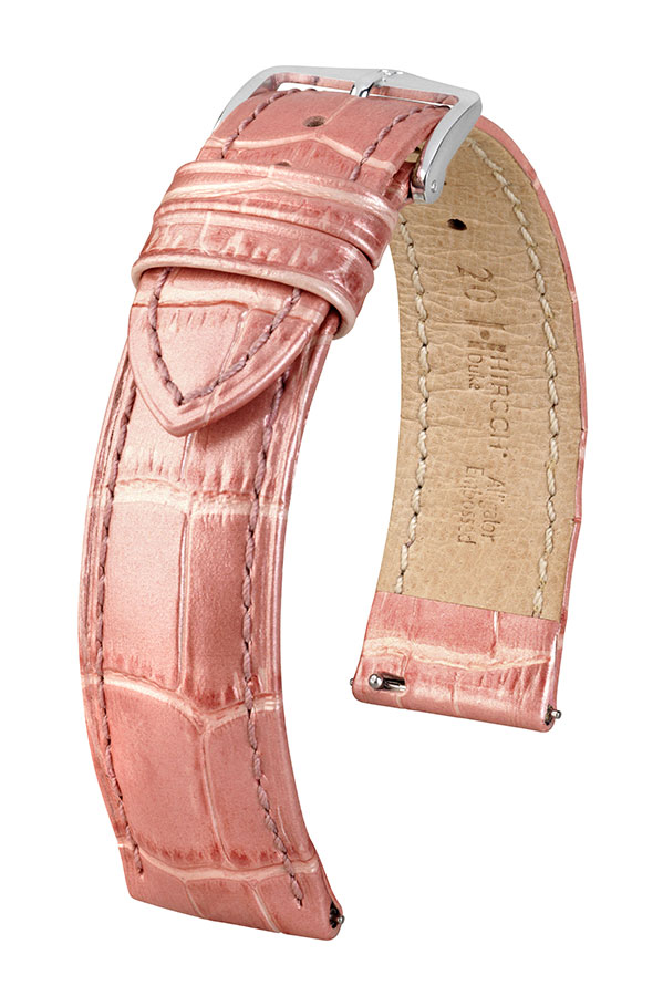 Limitovaná edice kovového dámského řemínku k hodinkám Hirsch Duke . Nejjemnější italská teletina v růžové barvě s přirozeně vypadající embosováním aligátora. Polomatný povrch s charakteristickým dvoubarevným odstínem. Kovové provedení je ideální pro dámské lesklé nebo zlaté hodinky. Vodě a potu odolná podšívka Hirsch Softglove zajišťuje nejvyšší komfort nošení i při vyšší zátěži. Tento řemínek k hodinkám je vybaven teleskopy Hirsch Quick-Release , které umožňují nasazení bez použití nářadí.
