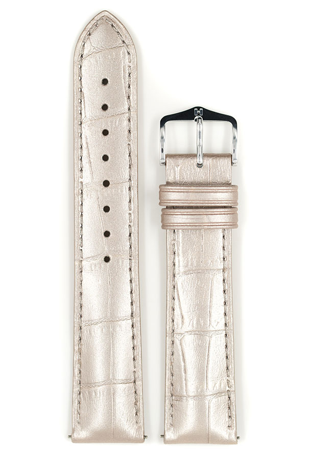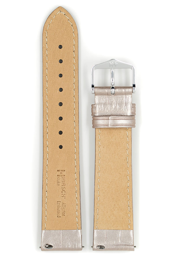 Limitovaná edice kovového dámského řemínku k hodinkám Hirsch Duke . Nejjemnější italská teletina ve stříbrné barvě s přirozeně vypadající embosováním aligátora. Polomatný povrch s charakteristickým dvoubarevným odstínem. Kovové provedení je ideální pro dámské lesklé nebo zlaté hodinky. Vodě a potu odolná podšívka Hirsch Softglove zajišťuje nejvyšší komfort nošení i při vyšší zátěži. Tento řemínek k hodinkám je vybaven teleskopy Hirsch Quick-Release , které umožňují nasazení bez použití nářadí.