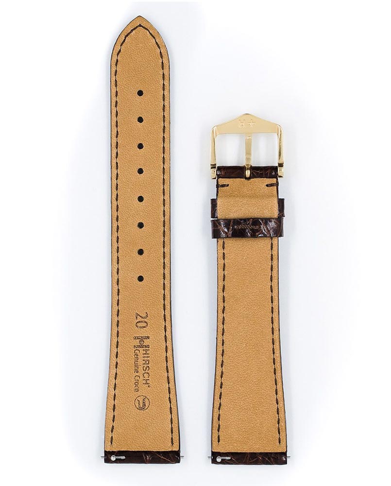 Hirsch Genuine Croco je exkluzivní hnědý řemínek k hodinkám. Vyrobeno z krokodýlí kůže, nadčasového klasického materiálu pro exkluzivní hodinky. Pečlivě vybraná, vzácná krokodýlí kůže s vysokým leskem. Jemně vypadající řemínek s jemným prošíváním a elastickou podšívkou z kůže, která dodává lehkost, měkkost a pružnost. Kožený náramek je ručně vyrobený, hluboce barvený a vyrobený ze stran jihoamerického krokodýla. Vyznačuje se typickou povrchovou strukturou v podobě mřížky složené z větších a menších šupin. Použití speciálních teleskopů umožňuje montáž a demontáž pásu bez použití nářadí. Hirsch Genuine Croco je k dispozici ve velikostech 12 mm, 13 mm, 14 mm, 15 mm, 16 mm, 17 mm, 18 mm, 19 mm, 20 mm a 22 mm.