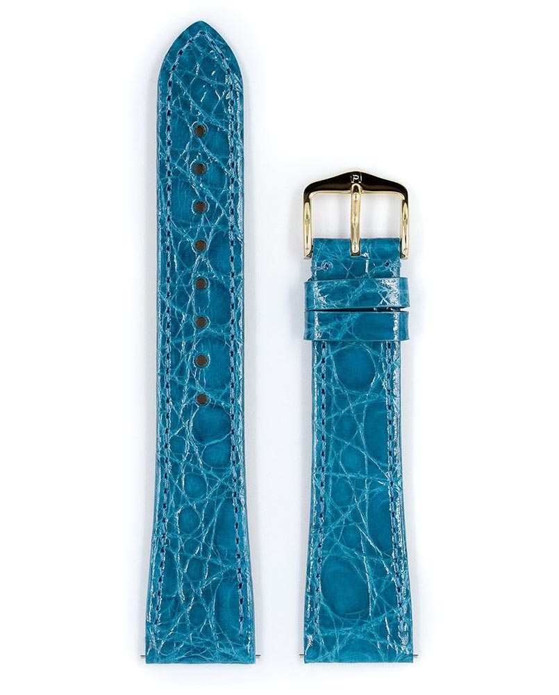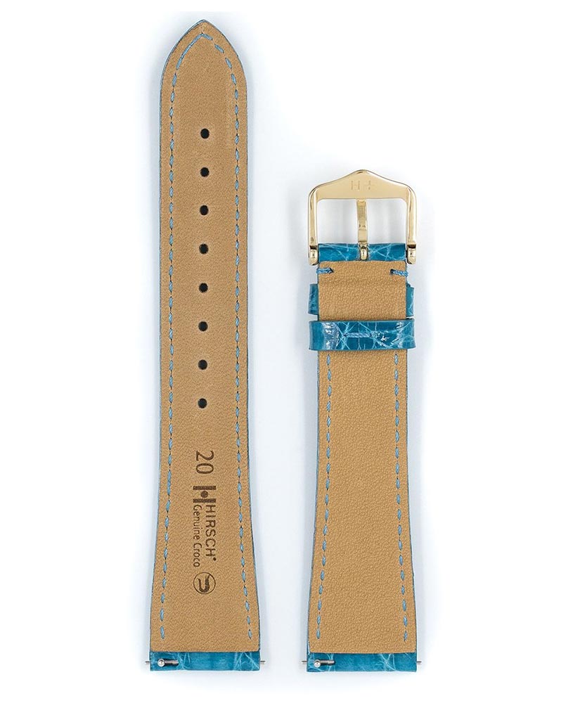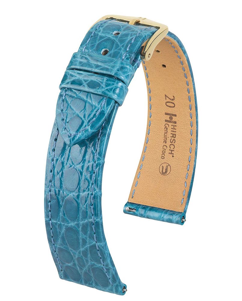 Hirsch Genuine Croco je exkluzivní tyrkysový řemínek k hodinkám. Vyrobeno z krokodýlí kůže, nadčasového klasického materiálu pro exkluzivní hodinky. Pečlivě vybraná, vzácná krokodýlí kůže s vysokým leskem. Jemně vypadající řemínek s jemným prošíváním a elastickou podšívkou z kůže, která dodává lehkost, měkkost a pružnost. Kožený náramek je ručně vyrobený, hluboce barvený a vyrobený ze stran jihoamerického krokodýla. Vyznačuje se typickou povrchovou strukturou v podobě mřížky složené z větších a menších šupin. Použití speciálních teleskopů umožňuje montáž a demontáž pásu bez použití nářadí. Hirsch Genuine Croco je k dispozici ve velikostech 12 mm, 13 mm, 14 mm, 15 mm, 16 mm, 17 mm, 18 mm, 19 mm, 20 mm a 22 mm.