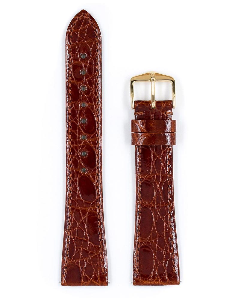 Hirsch Genuine Croco je exkluzivní zlatohnědý řemínek k hodinkám. Vyrobeno z krokodýlí kůže, nadčasového klasického materiálu pro exkluzivní hodinky. Pečlivě vybraná, vzácná krokodýlí kůže s vysokým leskem. Jemně vypadající řemínek s jemným prošíváním a elastickou podšívkou z kůže, která dodává lehkost, měkkost a pružnost. Kožený náramek je ručně vyrobený, hluboce barvený a vyrobený ze stran jihoamerického krokodýla. Vyznačuje se typickou povrchovou strukturou v podobě mřížky složené z větších a menších šupin. Použití speciálních teleskopů umožňuje montáž a demontáž pásu bez použití nářadí. Hirsch Genuine Croco je k dispozici ve velikostech 12 mm, 13 mm, 14 mm, 15 mm, 16 mm, 17 mm, 18 mm, 19 mm, 20 mm a 22 mm.