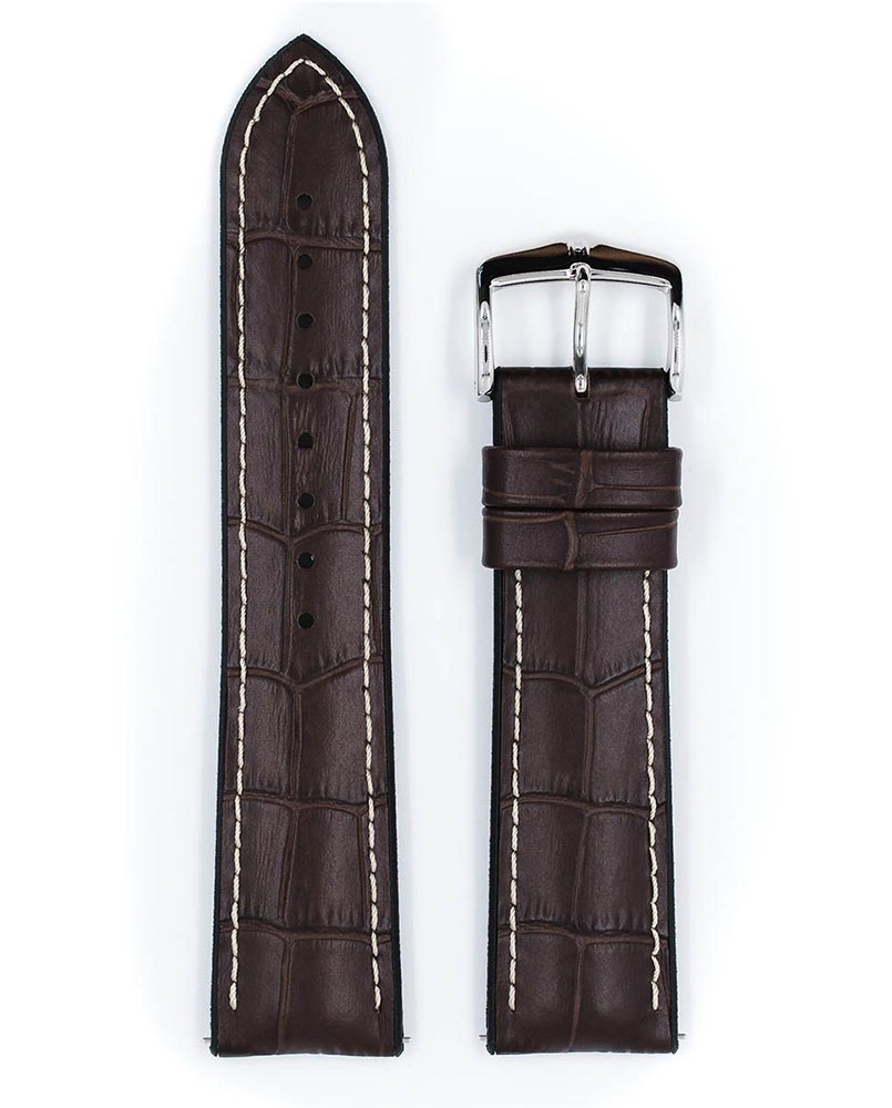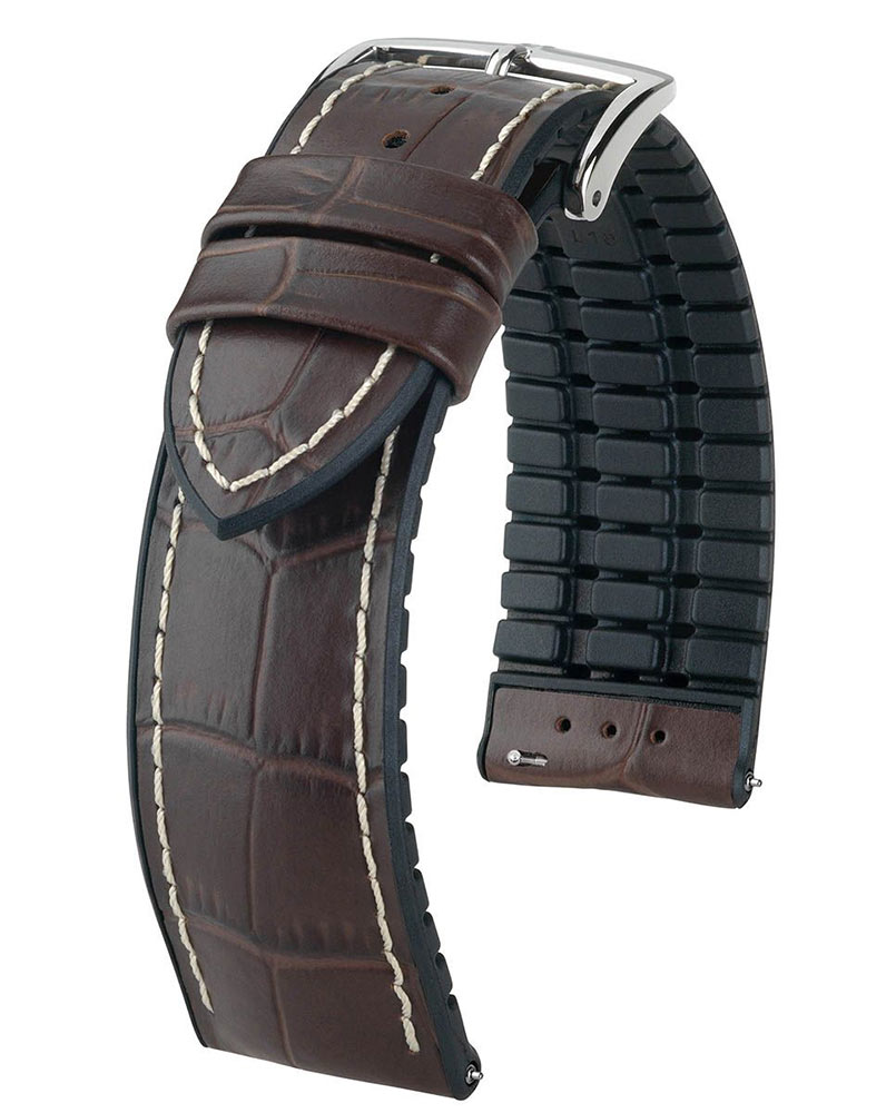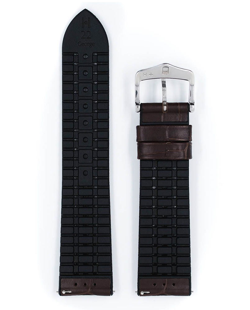 Hnědý řemínek k hodinkám Hirsch George s černou gumovou spodní částí. Kombinace klasického aligátořího vzoru s voděodolnou gumou je činí spolehlivými, extrémně odolnými a zároveň se hodí ke všem pánským hodinkám. Telecí kůže Toscana s embosováním aligátora zvýrazněná kontrastním prošíváním a viditelným okrajem dodává tomuto klasickému řemínku na hodinky nesrovnatelné kouzlo. George je k dispozici v šířkách 20 mm, 22 mm a 24 mm. Použití teleskopů Quick-Release umožňuje připevnit řemínek k pouzdru hodinek bez použití nářadí.