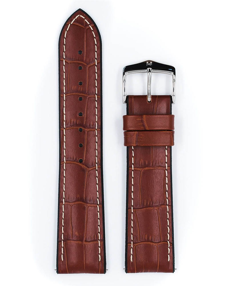 Zlatohnědý řemínek k hodinkám Hirsch George s černou gumovou spodní částí. Kombinace klasického aligátořího vzoru s voděodolnou gumou je činí spolehlivými, extrémně odolnými a zároveň se hodí ke všem pánským hodinkám. Telecí kůže Toscana s embosováním aligátora zvýrazněná kontrastním prošíváním a viditelným okrajem dodává tomuto klasickému řemínku na hodinky nesrovnatelné kouzlo. George je k dispozici v šířkách 20 mm, 22 mm a 24 mm. Použití teleskopů Quick-Release umožňuje připevnit řemínek k pouzdru hodinek bez použití nářadí.