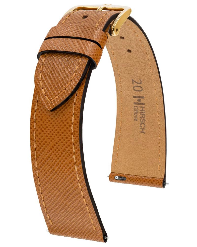 Klasický, luxusní řemínek k hodinkám, Hirsch Giffone, zlatohnědý. Vyrobeno pomocí nejnovější technologie Hirsch, která zdůrazňuje jemný vzhled při zachování neuvěřitelné odolnosti. Trojité, ručně lakované okraje v kombinaci se vzorem inspirovaným nejnovějšími módními trendy - Saffiano. Inovativní materiál proslavený a patentovaný módním domem Prada. Představena do luxusní řady kabelek s moderním, kostkovaným povrchem. Tento design si rychle získal oblibu a je také nadšeně používán dalšími exkluzivními značkami, jako je Michael Kors, DKNY, Burberry a Love Moschino. Díky své tloušťce 2,5 mm se Giffone dokonale hodí k tenkým klasickým hodinkám.
