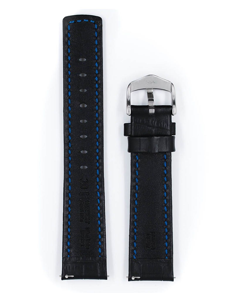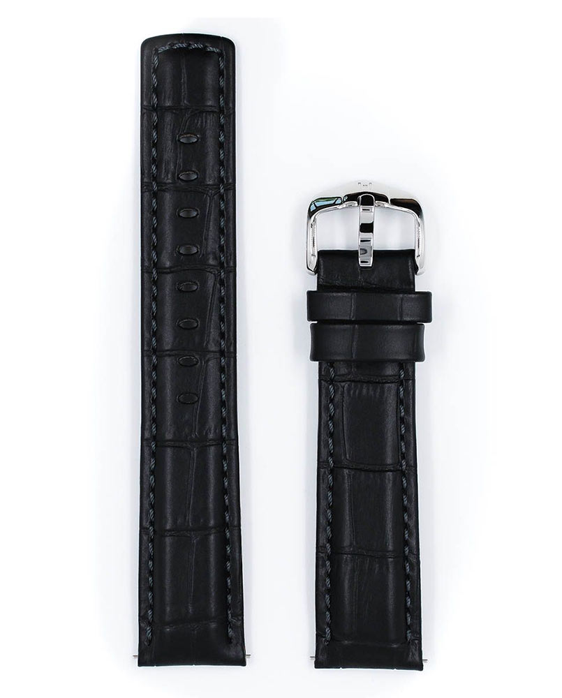Řemínek k hodinkám, Hirsch Grand Duke černý. Sportovní řemínek z voděodolné, nejlepší italské teletiny s dokonale reprodukovanou strukturou kůže aligátora. Pružná, měkká, high-tech podšívka z kůže a široká přezka se skvělým tvarem zdůrazňují výrazný design tohoto sportovního opasku. Grand Duke se perfektně hodí k velkým masivním hodinkám a speciální teleskopy umožňují nasazování a sundávání řemínku bez pomoci hodináře. Řemínek je k dispozici v 18 mm, 20 mm, 22 mm a 24 mm.