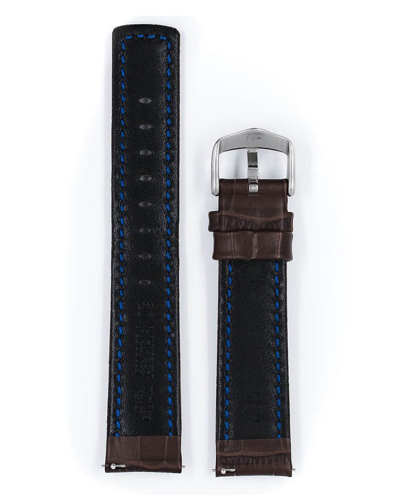 Řemínek k hodinkám, Hirsch Grand Duke hnědý . Sportovní řemínek z voděodolné, nejlepší italské teletiny s dokonale reprodukovanou strukturou kůže aligátora. Pružná, měkká, high-tech podšívka z kůže a široká přezka se skvělým tvarem zdůrazňují výrazný design tohoto sportovního opasku. Grand Duke se perfektně hodí k velkým masivním hodinkám a speciální teleskopy umožňují nasazování a sundávání řemínku bez pomoci hodináře. Řemínek je k dispozici v 18 mm, 20 mm, 22 mm a 24 mm.