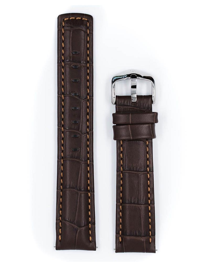 Řemínek k hodinkám, Hirsch Grand Duke hnědý . Sportovní řemínek z voděodolné, nejlepší italské teletiny s dokonale reprodukovanou strukturou kůže aligátora. Pružná, měkká, high-tech podšívka z kůže a široká přezka se skvělým tvarem zdůrazňují výrazný design tohoto sportovního opasku. Grand Duke se perfektně hodí k velkým masivním hodinkám a speciální teleskopy umožňují nasazování a sundávání řemínku bez pomoci hodináře. Řemínek je k dispozici v 18 mm, 20 mm, 22 mm a 24 mm.