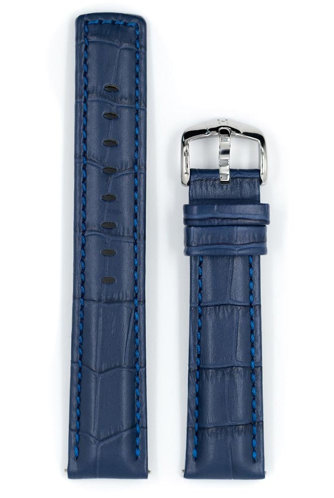 Řemínek k hodinkám, Hirsch Grand Duke modrý. Sportovní řemínek z voděodolné, nejlepší italské teletiny s dokonale reprodukovanou strukturou kůže aligátora. Pružná, měkká, high-tech podšívka z kůže a široká přezka se skvělým tvarem zdůrazňují výrazný design tohoto sportovního opasku. Grand Duke se perfektně hodí k velkým masivním hodinkám a speciální teleskopy umožňují nasazování a sundávání řemínku bez pomoci hodináře. Řemínek je k dispozici v 18 mm, 20 mm, 22 mm a 24 mm.