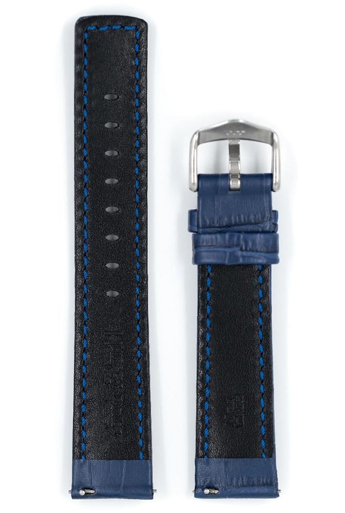 Řemínek k hodinkám, Hirsch Grand Duke modrý. Sportovní řemínek z voděodolné, nejlepší italské teletiny s dokonale reprodukovanou strukturou kůže aligátora. Pružná, měkká, high-tech podšívka z kůže a široká přezka se skvělým tvarem zdůrazňují výrazný design tohoto sportovního opasku. Grand Duke se perfektně hodí k velkým masivním hodinkám a speciální teleskopy umožňují nasazování a sundávání řemínku bez pomoci hodináře. Řemínek je k dispozici v 18 mm, 20 mm, 22 mm a 24 mm.