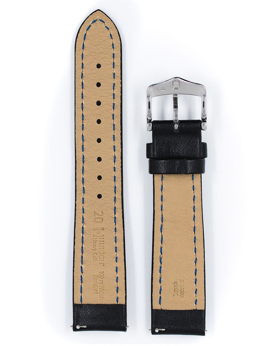 Černý řemínek k hodinkám Hirsch Heavy Calf . Produkt pevný a odolný jako prvotřídní teletina, ze které byl vyroben. Vodě a potu odolný řemínek s odolnou podšívkou z vláken pravé kůže a výrazným bílým prošíváním. Stabilní upevnění a konvexní tvar dokonale ladí s velkými sportovními hodinkami.