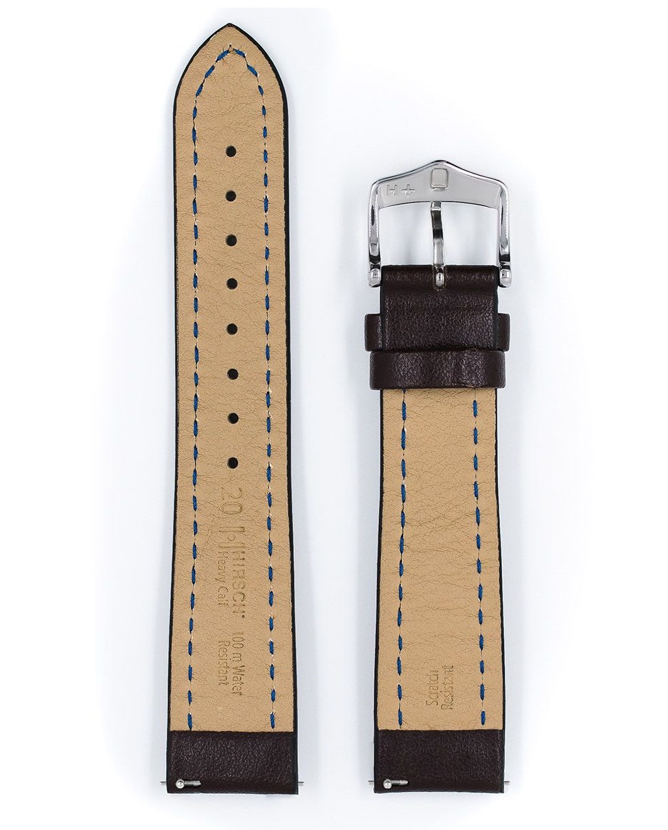 Hnědý řemínek k hodinkám Hirsch Heavy Calf . Produkt pevný a odolný jako prvotřídní teletina, ze které byl vyroben. Vodě a potu odolný řemínek s odolnou podšívkou z vláken pravé kůže a výrazným bílým prošíváním. Stabilní upevnění a konvexní tvar dokonale ladí s velkými sportovními hodinkami.