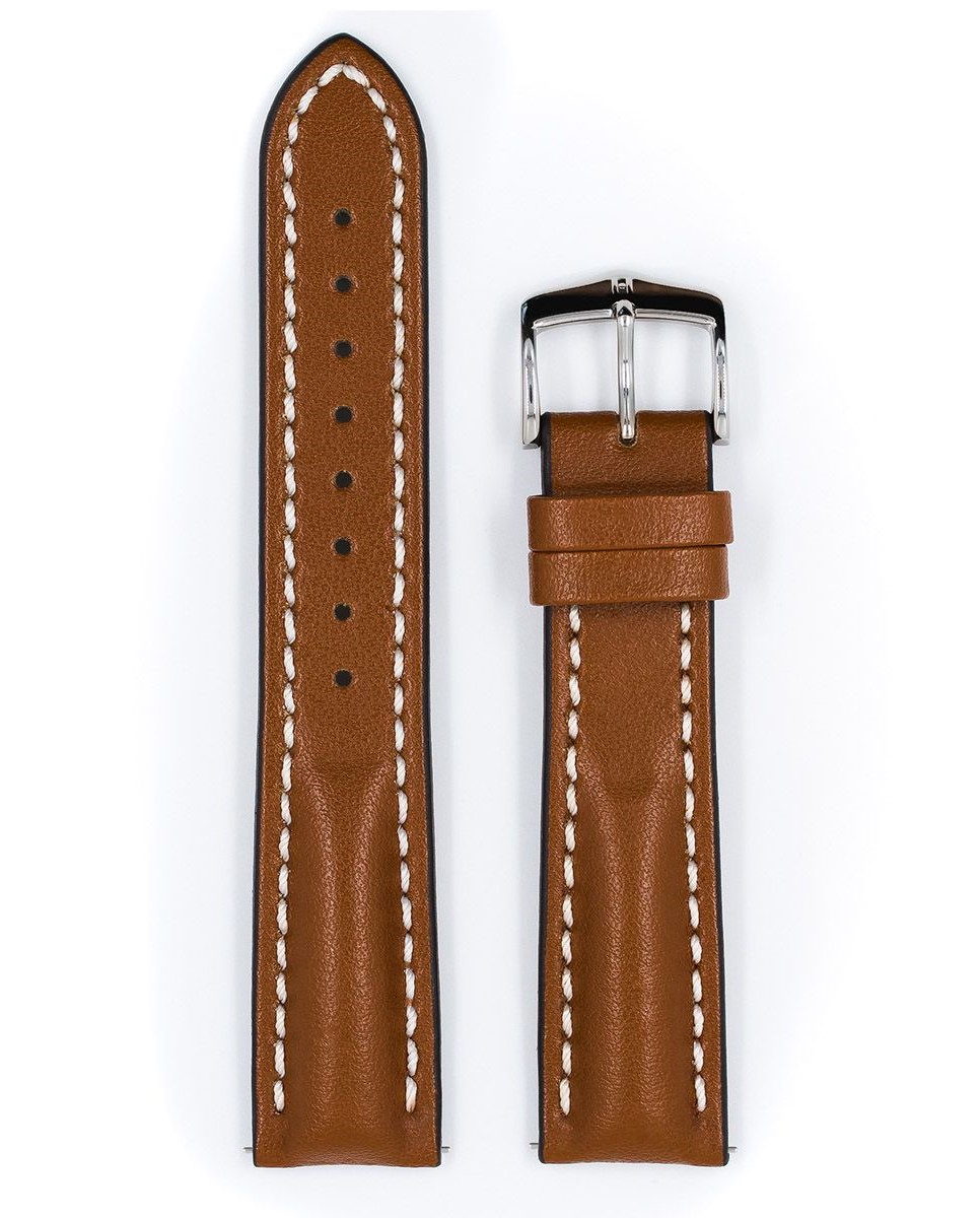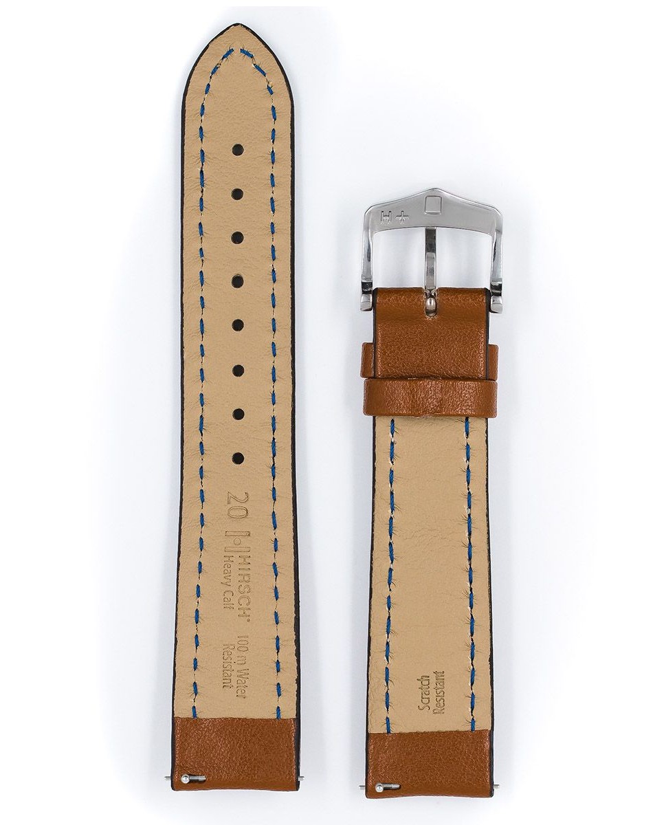 Hnědý řemínek k hodinkám Hirsch Heavy Calf . Produkt pevný a odolný jako prvotřídní teletina, ze které byl vyroben. Vodě a potu odolný řemínek s odolnou podšívkou z vláken pravé kůže a výrazným bílým prošíváním. Stabilní upevnění a konvexní tvar dokonale ladí s velkými sportovními hodinkami.