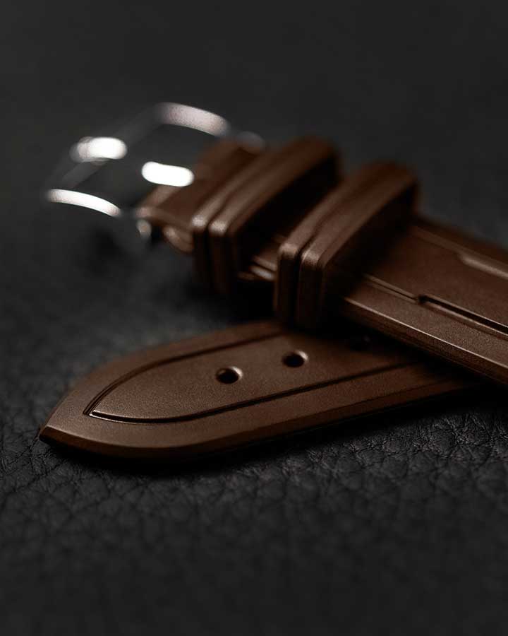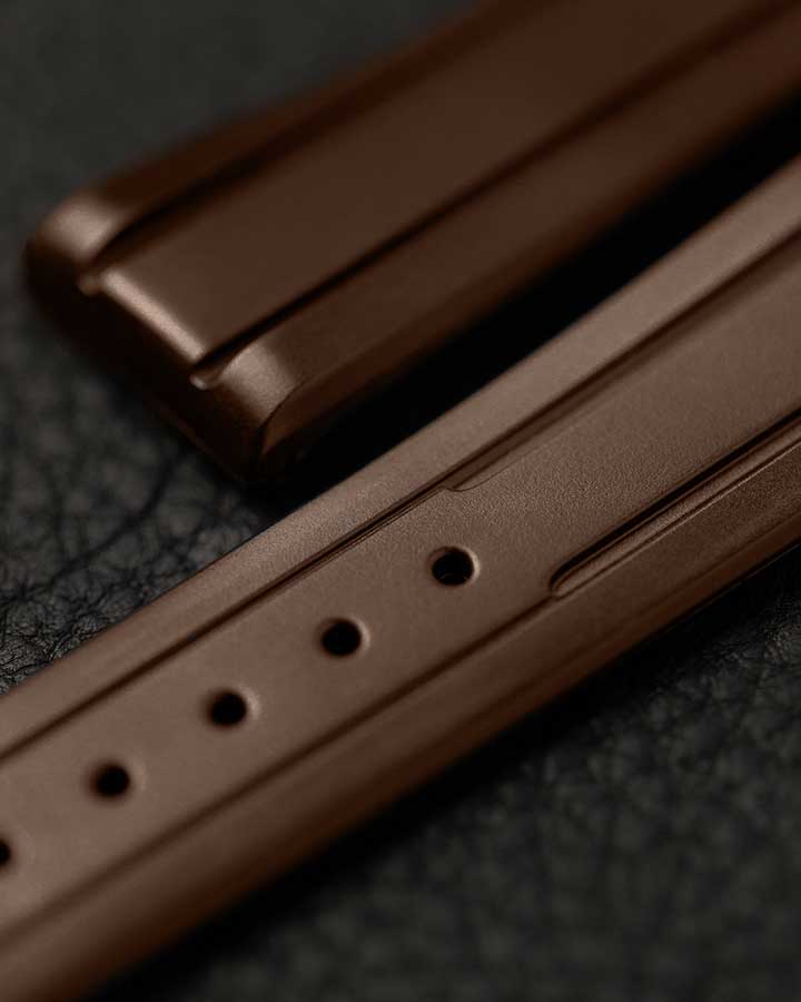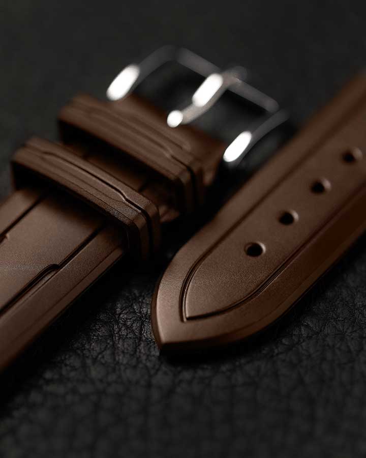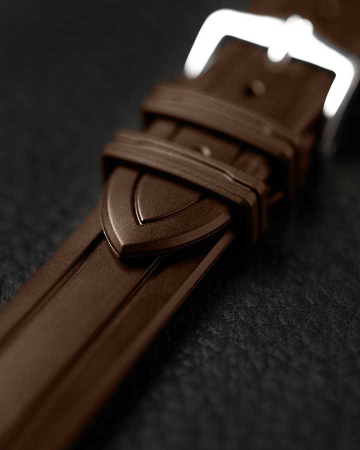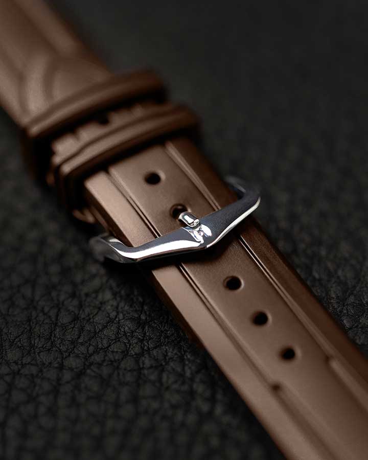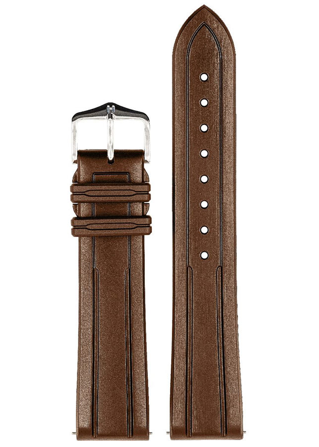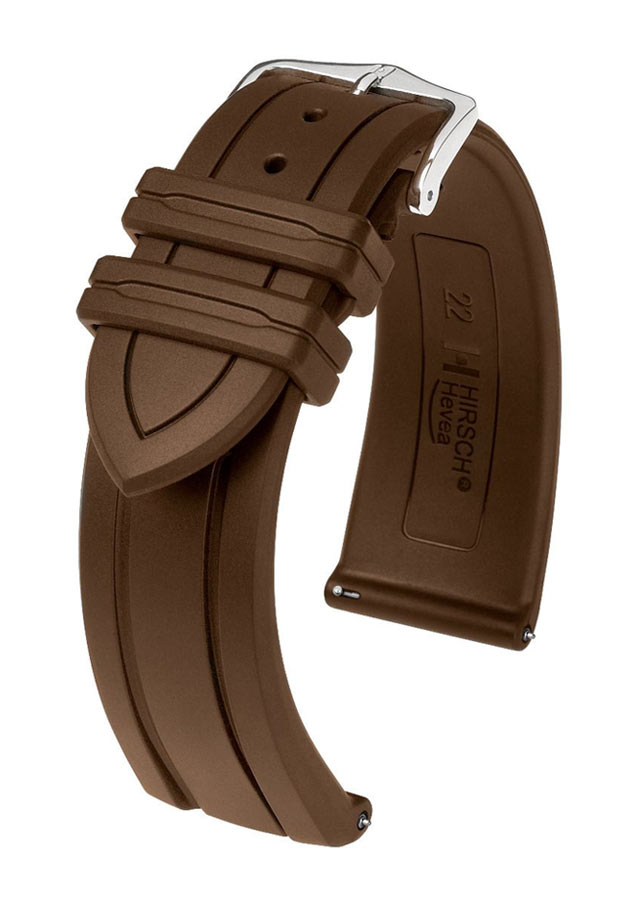 Hnědý řemínek k hodinkám Hirsch Hevea - špičková technologie v elegantním prostředí. Pryž HIRSCH Premium je zcela odolná vůči vodě a dalším vnějším faktorům a zároveň je mnohem měkčí než tradiční syntetické materiály. Mírně zakřivená vnitřní strana řemínku zabraňuje přilepení k zápěstí a zajišťuje optimální cirkulaci vzduchu a nejvyšší komfort nošení. Zamykací systém poutka na opasek integrovaný do opasku udržuje poutko na místě, takže se nepohybuje. Quick-Release System umožňuje montáž bez dalších teleskopů. Teleskopický prvek vyčnívající zespodu stačí posunout tak, abyste mohli popruh zasunout do pouzdra a nasadit bez použití nářadí.