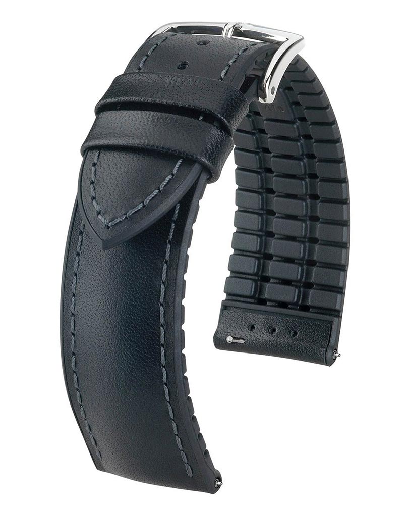 Hirsch James v černém je třída sama pro sebe. Autentický, tradiční a extrémně odolný řemínek k hodinkám. Tradice a inovace nemusí být v rozporu. Pod nádherně měkkým svrškem kůže s decentním, elegantním designem se skrývá nejmodernější technologie, která se dnes při výrobě opasků používá. Flexibilní, voděodolná guma pro neuvěřitelné pohodlí při nošení. Navíc díky speciálně navrženému dnu ruka dýchá a nepotí se. Speciální teleskopy umožňují připevnění popruhu bez použití nářadí. James je perfektní řemínek na plavání, který lze použít nejen na sportovní hodinky, ale i na klasické.