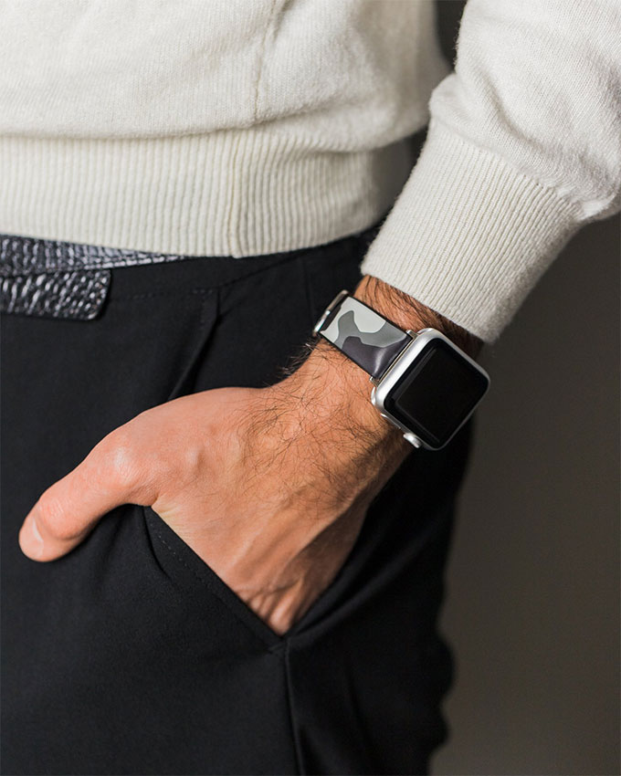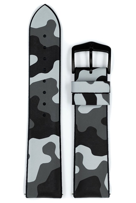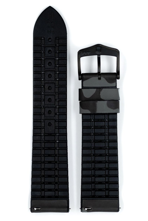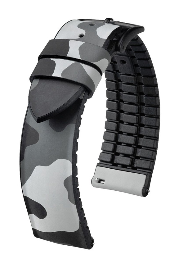 Hirsch John , šedý camo řemínek k hodinkám. Vodotěsné, extrémně odolné a vyrobené z Hirsch Premium Caoutchouc pryže. Ze spodní části řemínku jsou speciální horizontální drážky, které odvádějí vlhkost ven a umožňují ruce dýchat. Bezkonkurenční pohodlí při nošení v horkých dnech nebo při plavání. Svěží sportovní design je ideální pro sportovní a diverské hodinky. Hirsch John byl vybaven teleskopy, které umožňují připevnění k pouzdru hodinek bez použití nářadí.