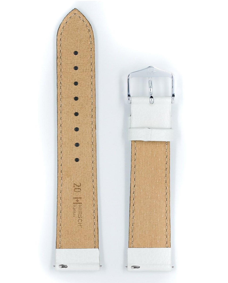 Bílý dámský řemínek k hodinkám Hirsch Kansas o šířce 14 mm a šířce zapínání 12 mm. Univerzální a nadčasový design tohoto modelu z něj dělá jeden z nejčastěji volených doplňků hodinek. Odolná teletina po vzoru buvolí kůže je prošita zelenou nití. Řemínek Kansas využívá speciální teleskopy, které usnadňují nasazování na hodinky.