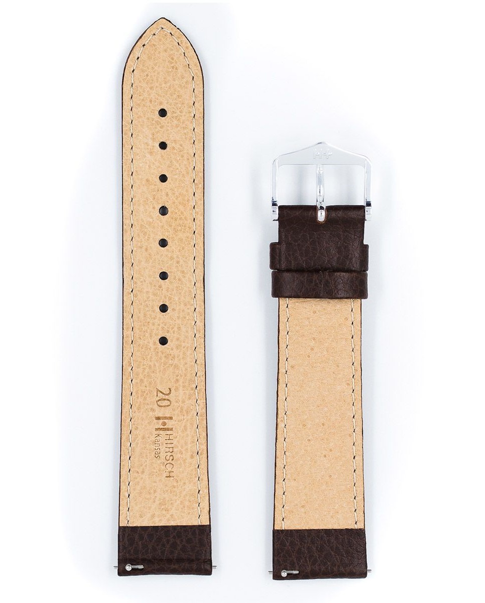 Hnědý dámský řemínek k hodinkám Hirsch Kansas o šířce 16 mm a šířce zapínání 14 mm. Univerzální a nadčasový design tohoto modelu z něj dělá jeden z nejčastěji volených doplňků hodinek. Odolná teletina po vzoru buvolí kůže je prošita zelenou nití. Řemínek Kansas využívá speciální teleskopy, které usnadňují nasazování na hodinky.