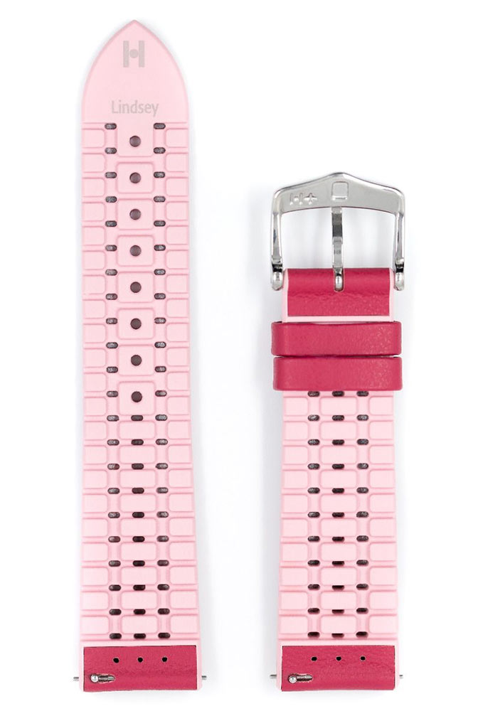 Řemínek k hodinkám Hirsch Lindsey – kde se sport setkává s módou . Lindsey je ženským ztělesněním kolekce vysoce odolných a neuvěřitelně pohodlných pásků z řady Hirsch Performance . Ať už při sportu nebo v každodenním životě: sportovní a funkční kombinace kůže a pryže Hirsch Premium zaručuje vynikající vlastnosti při nošení. Vnější kožená část je růžová a spodní je vyrobena z nejkvalitnější gumy v růžovém odstínu. Hirsch Lindsey byl vybaven teleskopy, které umožňují připevnění k pouzdru hodinek bez použití nářadí.