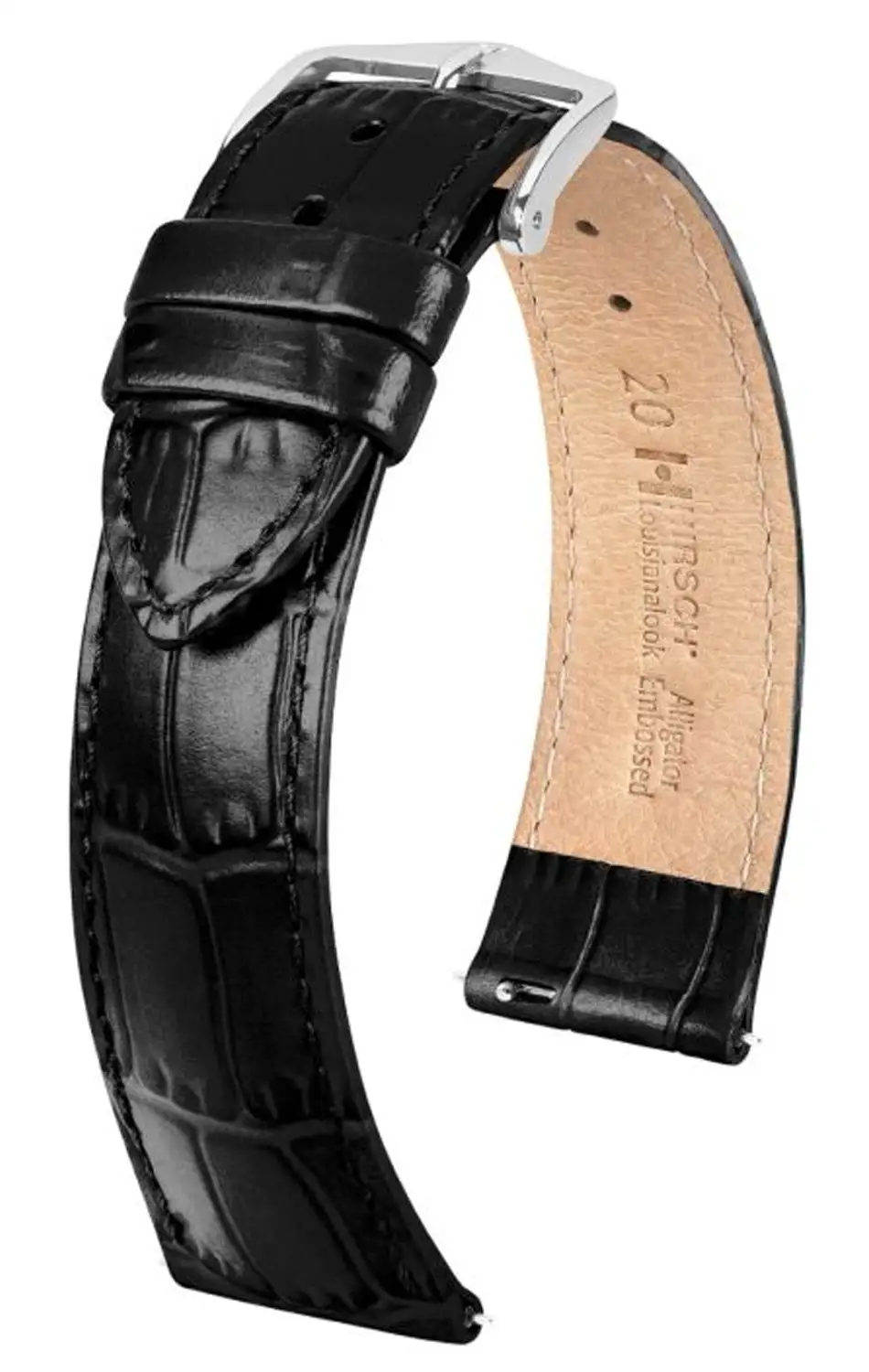 Řemínek Hirsch Louisianalook černý je elegantní a nadčasový doplněk ke klasickým hodinkám. Vyrobený z přírodní kůže s jemným leskem vyniká charakteristickým embossováním ve stylu aligátora, které mu dodává vytříbený charakter. Precizně zpracované hrany a prošití v barvě řemínku podtrhují důraz na detaily.