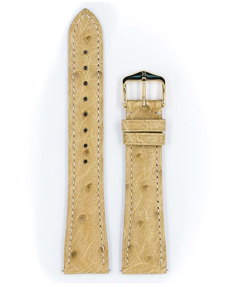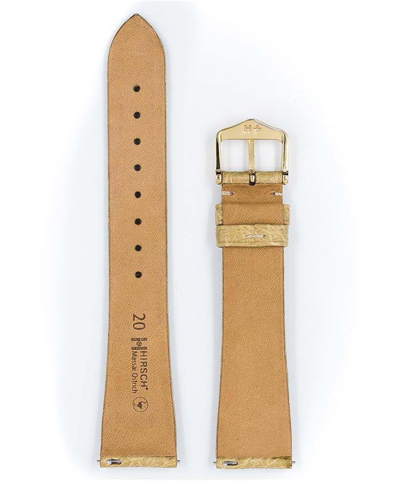 Klasický a nadčasový řemínek k hodinkám Hirsch Massai Ostrich s výrazným charakterem. Sametově měkká, hluboce soudkovaná kůže z afrického pštrosa s výrazným kulatým a kontrastním ražením. Hirsch Massai Pštros v béžové barvě je skutečnou raritou, která se skvěle hodí ke zlatým a luxusním hodinkám. V pásu Hirsch použil speciální teleskopy, které umožňují řemínek nasadit a sejmout bez použití nářadí. Massai Ostrich je k dispozici ve velikostech 14 mm, 16 mm, 17 mm, 18 mm, 19 mm, 20 mm, 21 mm a 22 mm.
