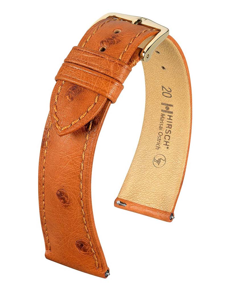 Klasický a nadčasový řemínek k hodinkám Hirsch Massai Ostrich s výrazným charakterem. Sametově měkká, hluboce soudkovaná kůže z afrického pštrosa s výrazným kulatým a kontrastním ražením. Hirsch Massai Pštros ve zlatohnědé barvě je skutečnou raritou, která se skvěle hodí ke zlatým a luxusním hodinkám. V pásu Hirsch použil speciální teleskopy, které umožňují řemínek nasadit a sejmout bez použití nářadí. Massai Ostrich je k dispozici ve velikostech 14 mm, 16 mm, 17 mm, 18 mm, 19 mm, 20 mm, 21 mm a 22 mm.