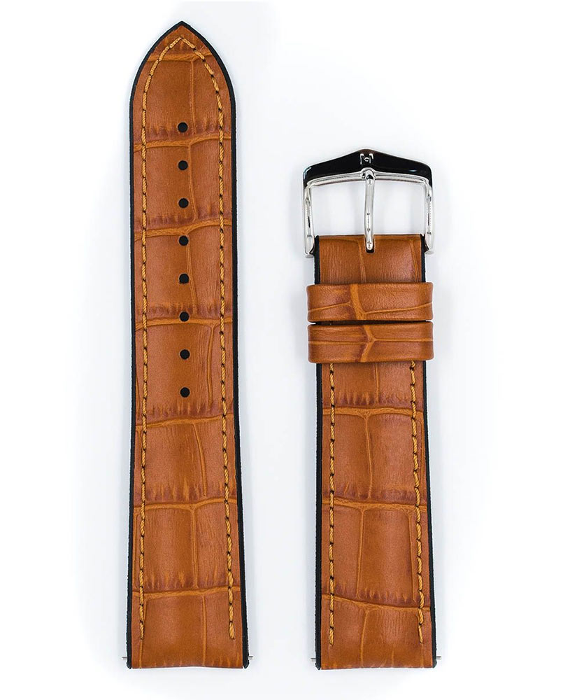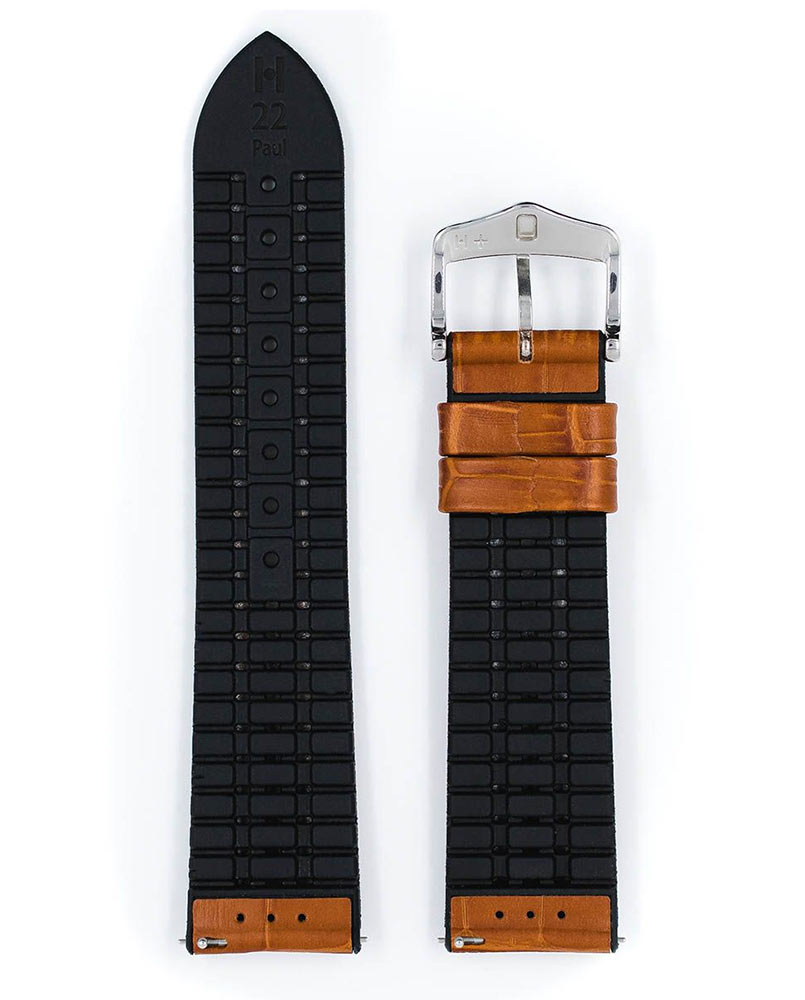 Řemínek k hodinkám Hirsch Paul vyrobený z vysoce kvalitní italské teletiny s aligátoří strukturou a gumou. Klasický tvar opasku a exkluzivní vzhled dodávají modelu Paul naprosto nadčasový charakter. Skutečný standard, který díky své revoluční gumové podrážce zaujme nejen svou univerzálností, ale také odolností. Řemínek je voděodolný a speciální drážky na spodní straně umožňují ruce dýchat a odvádět přebytečnou vodu po plavání. Hirsch Paul byl vybaven teleskopy, které umožňují připevnění k pouzdru hodinek bez použití nářadí. K dispozici v 18 mm, 20 mm, 22 mm, 24 mm a v pánských a dámských délkách, aby vyhovovaly všem hodinkám.