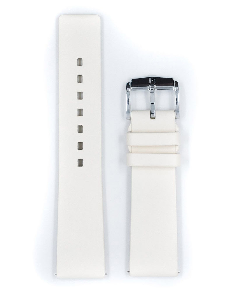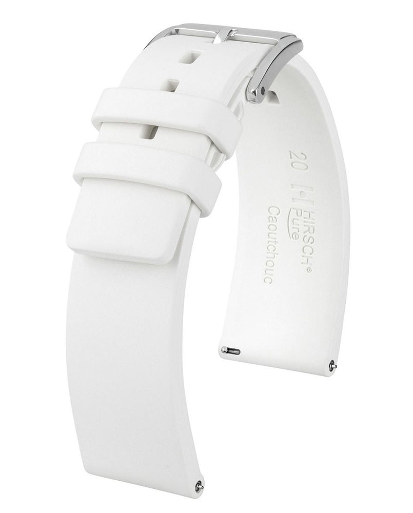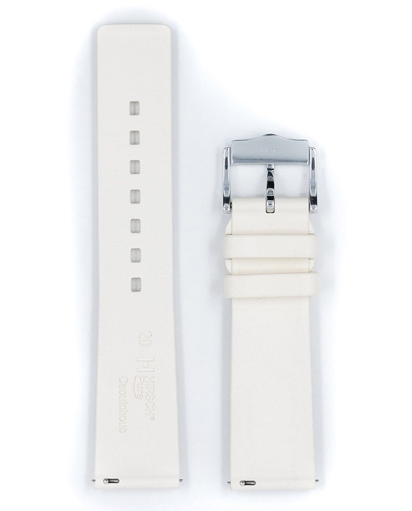 Bílý řemínek k hodinkám Hirsch Pure . Pro milovníky stylových, výrazných forem a nejvyšší funkčnosti. Vyrobeno z vysoce kvalitní gumy, skvěle se hodí ke sportovním i luxusním hodinkám. Model Pure je extrémně odolný a zcela vodotěsný a je odolnější a znatelně pohodlnější na nošení než tradiční syntetické náramky. Uzamykací systém poutka na opasek integrovaný do opasku zajišťuje dokonalou fixaci na zápěstí, které k pokožce přilne pouze po okrajích, usnadňuje cirkulaci vzduchu a zabraňuje vnikání vlhkosti na pokožku. Rychloupínací systém umožňuje připevnění bez použití nářadí. Stačí odsunout prvek dalekohledu vyčnívající zespodu, aby bylo možné řemínek zasunout do pouzdra.