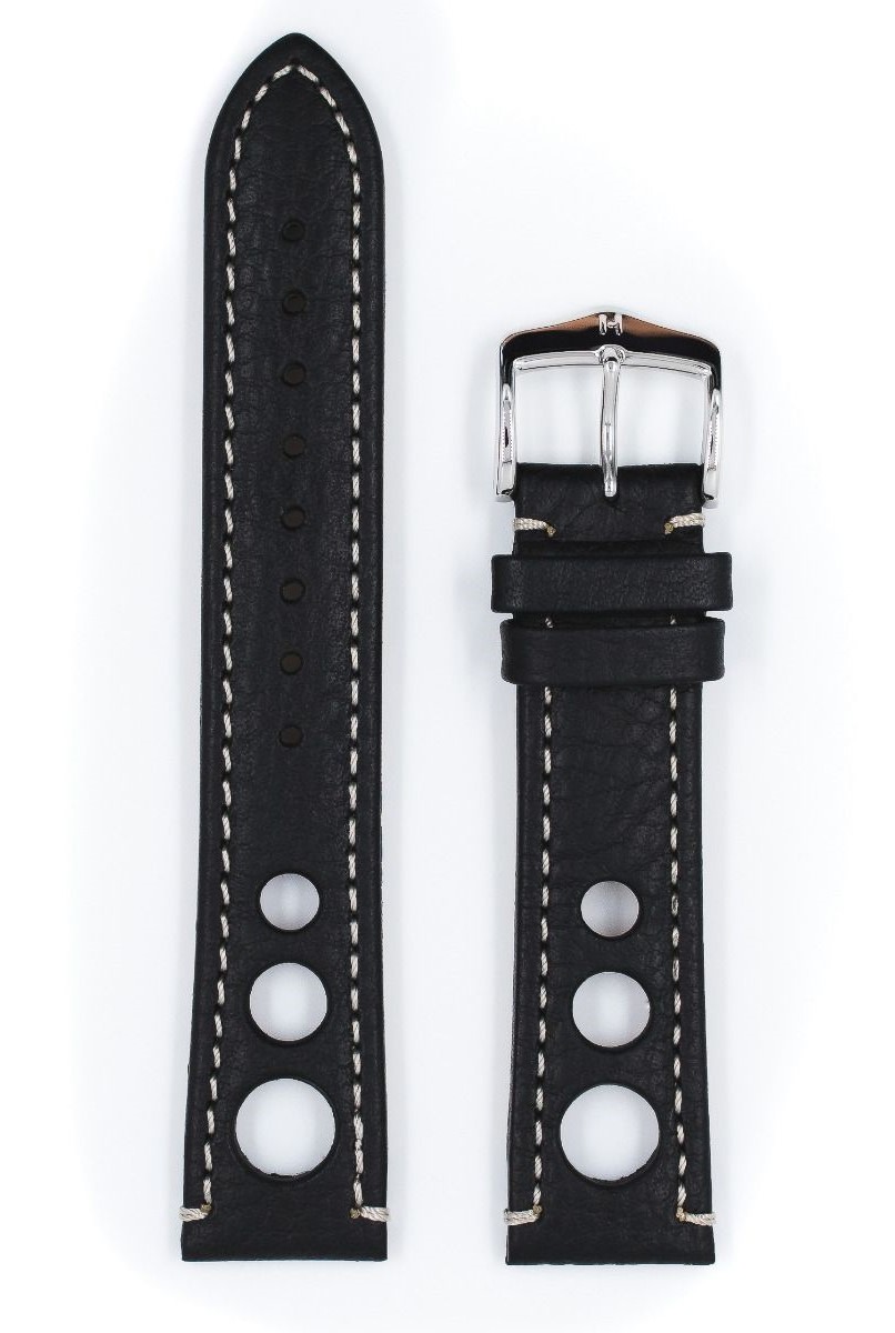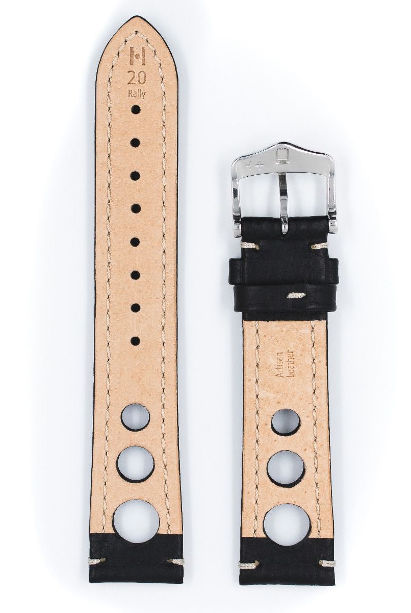 Řemínek k hodinkám Hirsch Rally 20 mm černý s červenými akcenty. Módní vintage styl inspirovaný před lety závodními rukavicemi, které měly speciální otvory, stejné jako v Rally pásu. Tyto otvory umožňují ruce dýchat, například v horkých dnech. Ručně dělaný šev u přezky a u patky hodinek, třikrát ručně lakované okraje. Vysoce kvalitní spona z nerezové oceli.