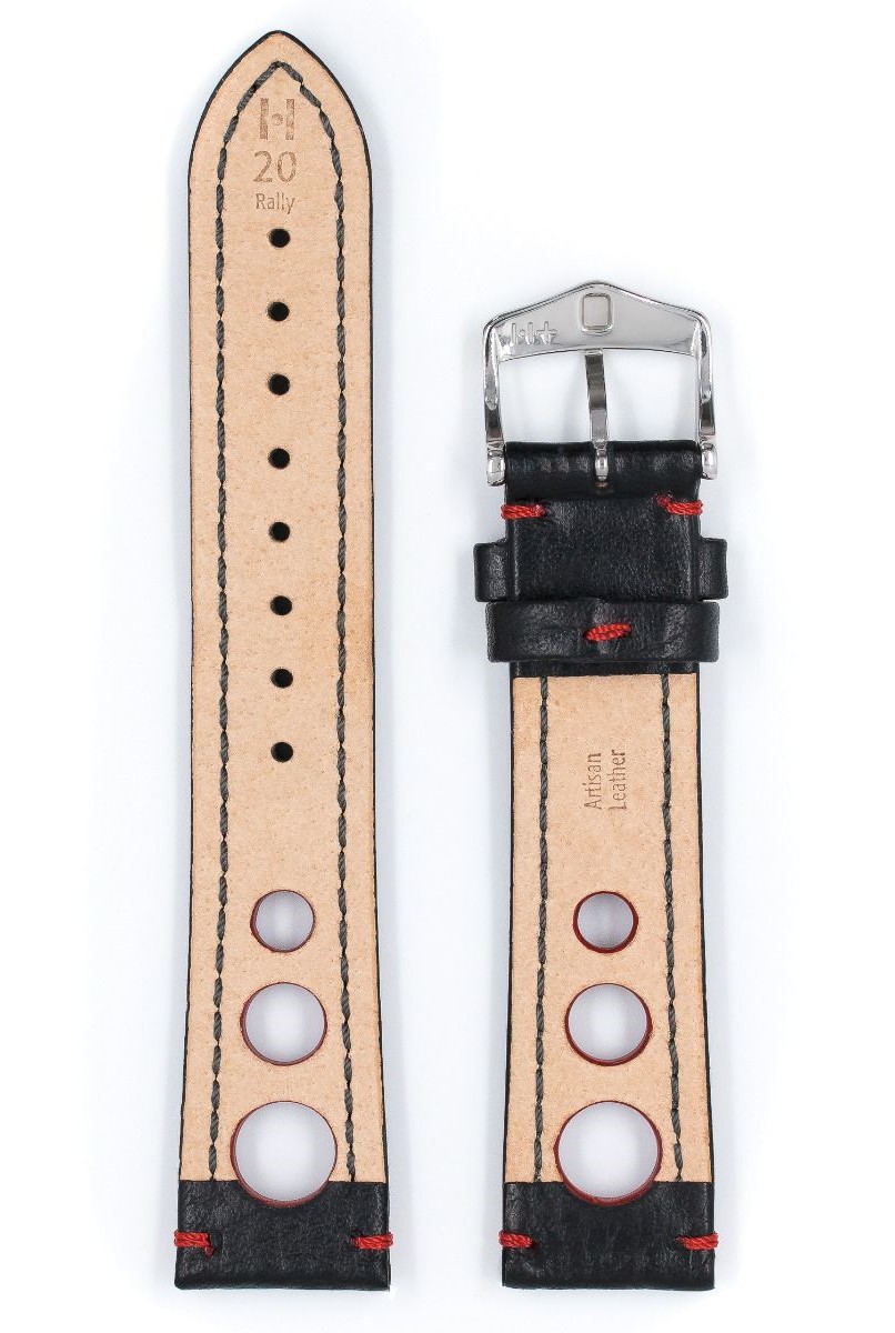 Řemínek k hodinkám Hirsch Rally 20 mm černý s červenými akcenty. Módní vintage styl inspirovaný před lety závodními rukavicemi, které měly speciální otvory, stejné jako v Rally pásu. Tyto otvory umožňují ruce dýchat, například v horkých dnech. Ručně dělaný šev u přezky a u patky hodinek, třikrát ručně lakované okraje. Vysoce kvalitní spona z nerezové oceli.