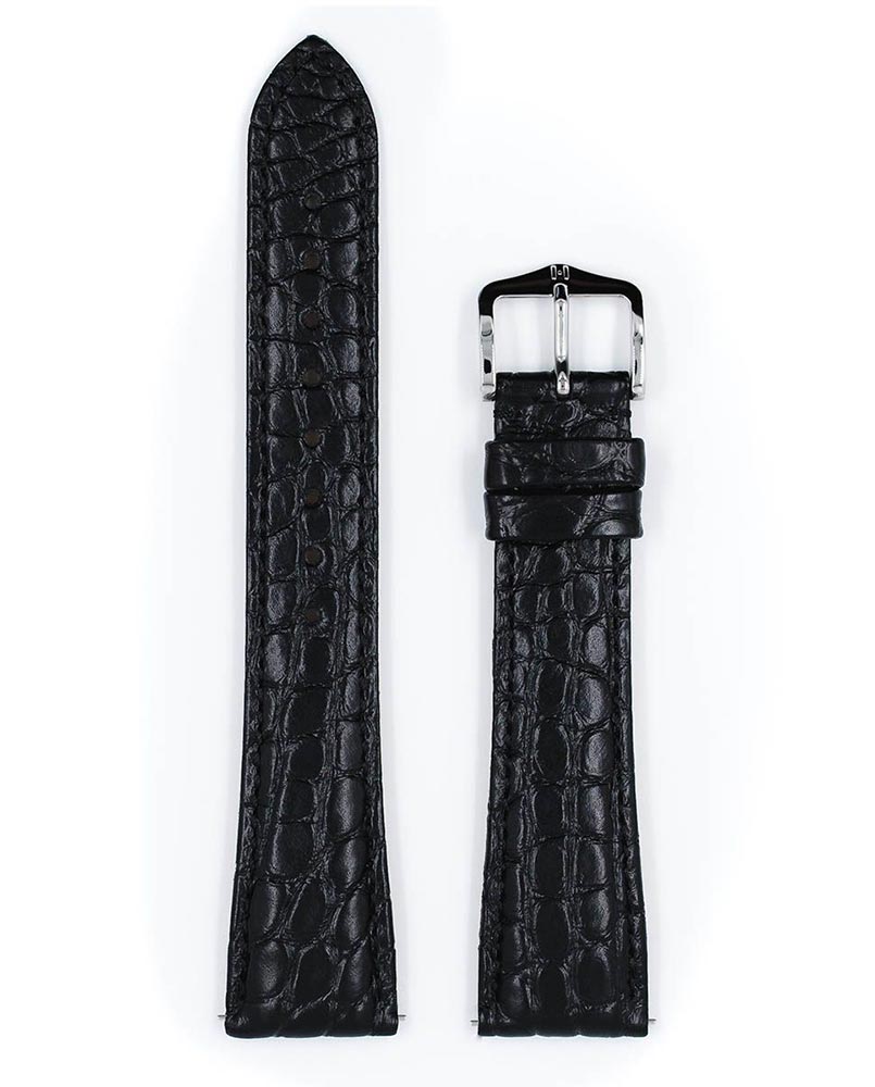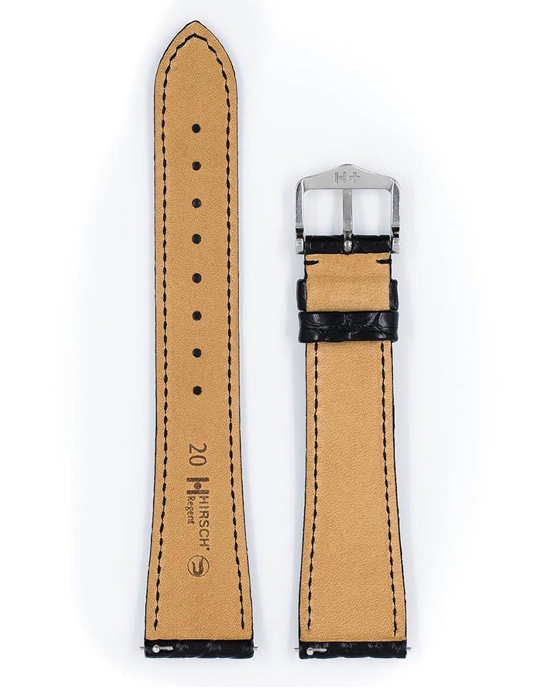 Černý řemínek k hodinkám Hirsch Regent vyzařuje klasickou krásu. Boční panel z aligátoří kůže s malými kruhovými vzory, které dodávají ušlechtilý nádech. Nejvyšší komfort nošení zajišťuje měkkost, elasticita vodě a potu odolné kůže a spona z nerezové oceli bez obsahu niklu. Ideální nabídka pro prestižní, elegantní hodinky. Použití speciálních teleskopů umožňuje montáž a demontáž pásu bez použití nářadí. Hirsch Regent je k dispozici ve velikostech 16 mm, 17 mm, 18 mm, 19 mm a 20 mm.