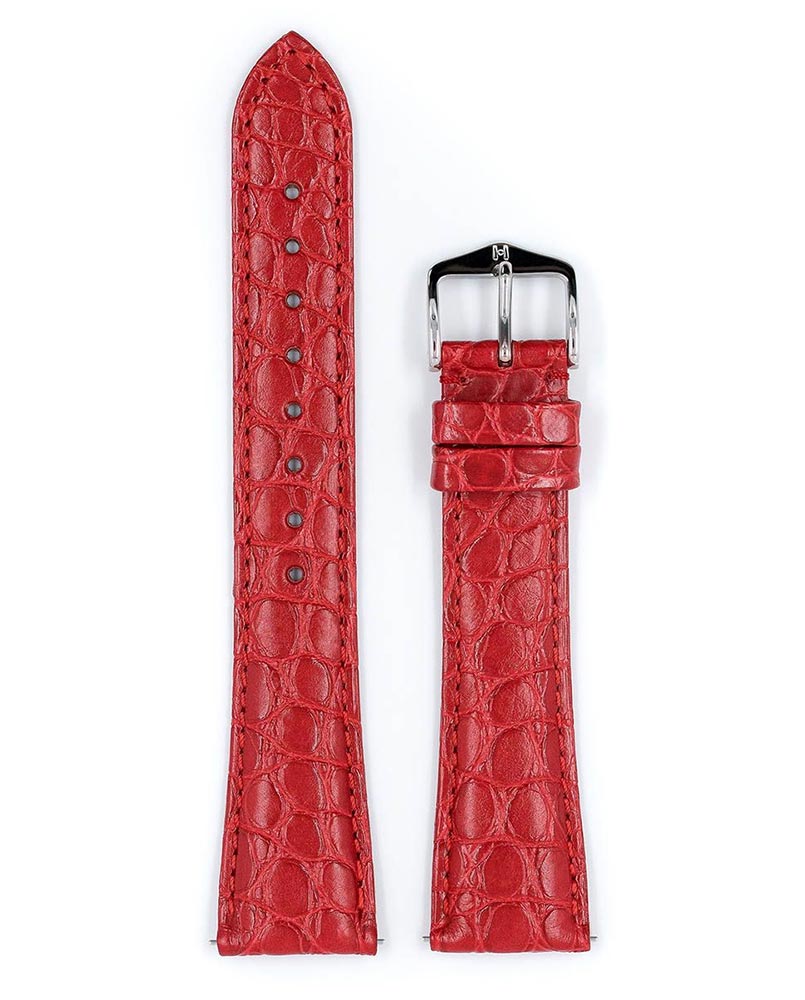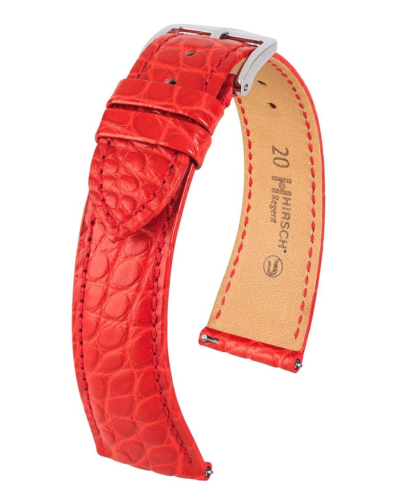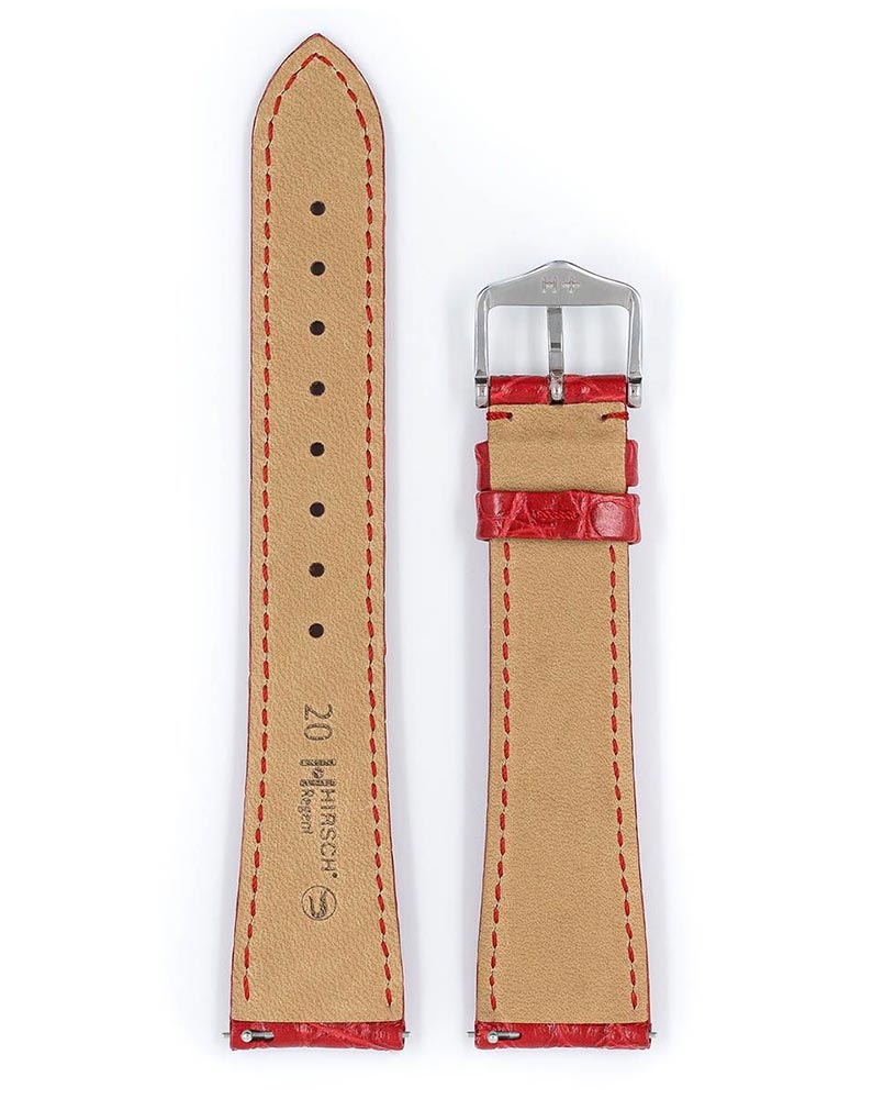 Červený řemínek k hodinkám Hirsch Regent vyzařuje klasickou krásu. Boční panel z aligátoří kůže s malými kruhovými vzory, které dodávají ušlechtilý nádech. Největší komfort nošení zajišťuje měkkost, elasticita vodě a potu odolné kůže a spona z nerezové oceli bez obsahu niklu. Ideální nabídka pro prestižní, elegantní hodinky. Použití speciálních teleskopů umožňuje montáž a demontáž pásu bez použití nářadí. Hirsch Regent je k dispozici ve velikostech 16 mm, 17 mm, 18 mm, 19 mm a 20 mm.