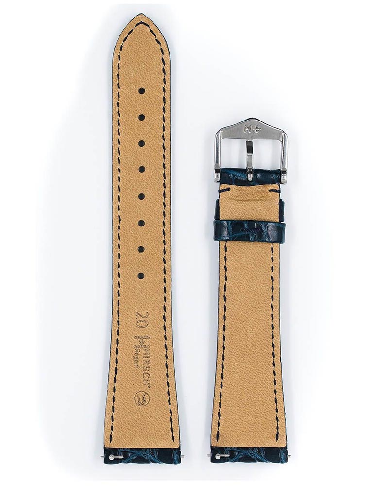 Modrý řemínek k hodinkám Hirsch Regent vyzařuje klasickou krásu. Boční panel vyrobený z aligátoří kůže s malými kruhovými vzory, které dodávají ušlechtilý nádech. Největší komfort nošení zajišťuje měkkost, elasticita vodě a potu odolné kůže a spona z nerezové oceli bez obsahu niklu. Ideální nabídka pro prestižní, elegantní hodinky. Použití speciálních teleskopů umožňuje montáž a demontáž pásu bez použití nářadí. Hirsch Regent je k dispozici ve velikostech 16 mm, 17 mm, 18 mm, 19 mm a 20 mm.