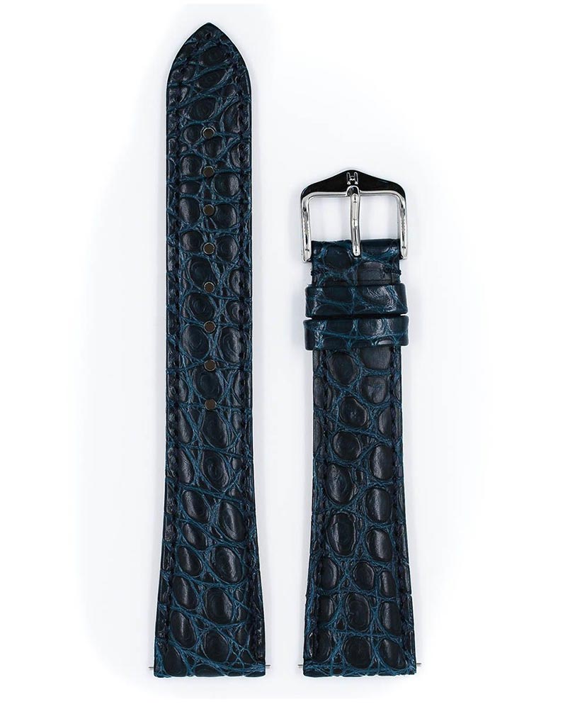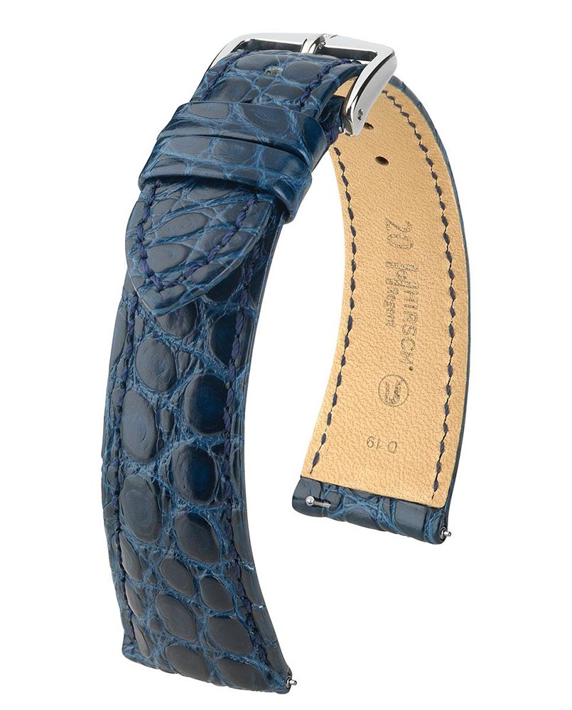 Modrý řemínek k hodinkám Hirsch Regent vyzařuje klasickou krásu. Boční panel vyrobený z aligátoří kůže s malými kruhovými vzory, které dodávají ušlechtilý nádech. Největší komfort nošení zajišťuje měkkost, elasticita vodě a potu odolné kůže a spona z nerezové oceli bez obsahu niklu. Ideální nabídka pro prestižní, elegantní hodinky. Použití speciálních teleskopů umožňuje montáž a demontáž pásu bez použití nářadí. Hirsch Regent je k dispozici ve velikostech 16 mm, 17 mm, 18 mm, 19 mm a 20 mm.