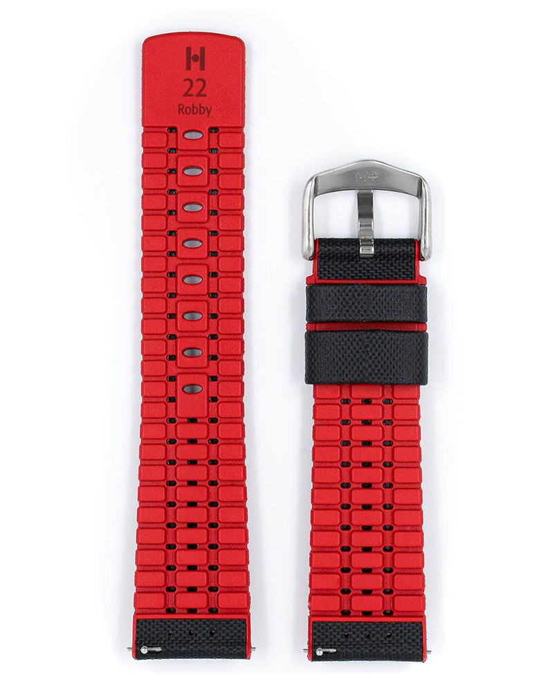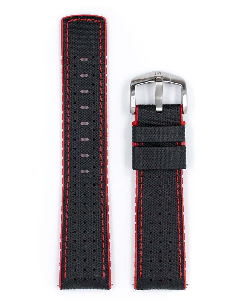 Řemínek k hodinkám, Hirsch Robby černý s červenou gumovou spodní stranou. Funkčnost a design v dokonalé harmonii – i v těch nejdrsnějších podmínkách. Italská teletina odolná proti opotřebení s přirozeným zvrásněním a vzhledem perforované plachtoviny. Speciální struktura pryžového jádra zaručuje rychlý odvod vlhkosti a nejvyšší komfort nošení. řemínek Hirsch Robby využívá teleskopy se systémem, který poskytuje možnost rychlého nasazení a sundání pásu bez použití nářadí.