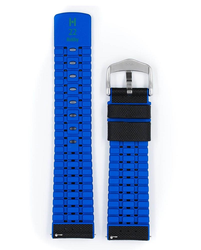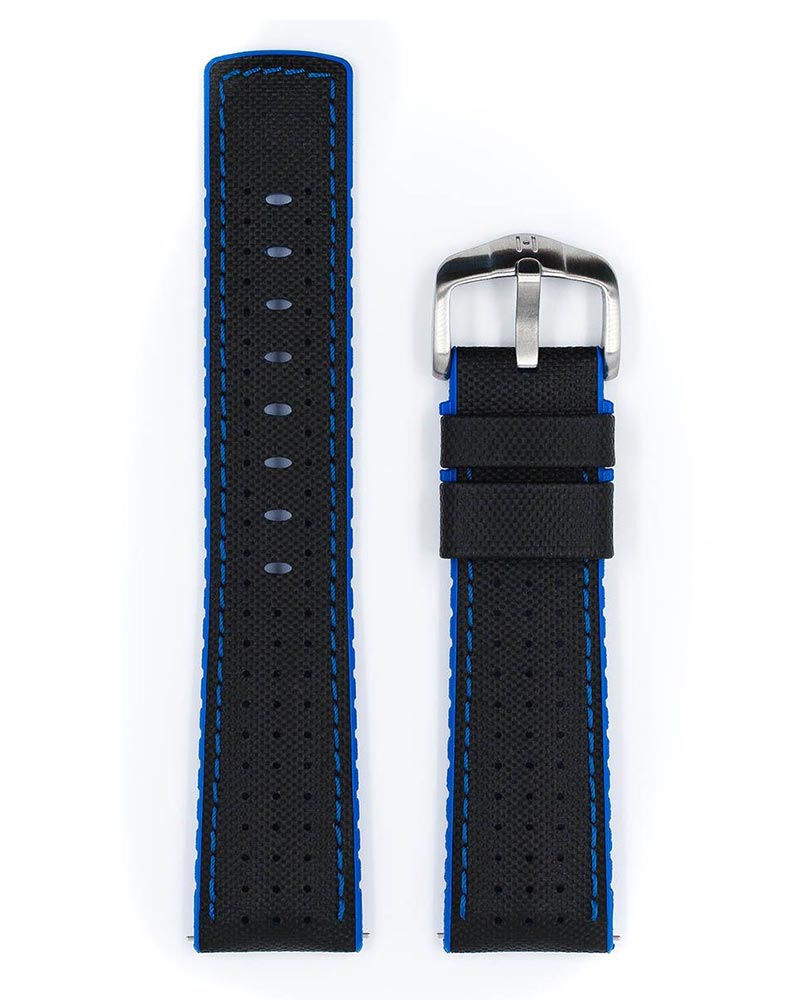 Řemínek k hodinkám, Hirsch Robby černý s modrou gumovou podložkou. Funkčnost a design v dokonalé harmonii – i v těch nejdrsnějších podmínkách. Italská teletina odolná proti opotřebení s přirozeným zvrásněním a vzhledem perforované plachtoviny. Speciální struktura pryžového jádra zaručuje rychlý odvod vlhkosti a nejvyšší komfort nošení. řemínek Hirsch Robby využívá teleskopy se systémem, který poskytuje možnost rychlého nasazení a sundání pásu bez použití nářadí.