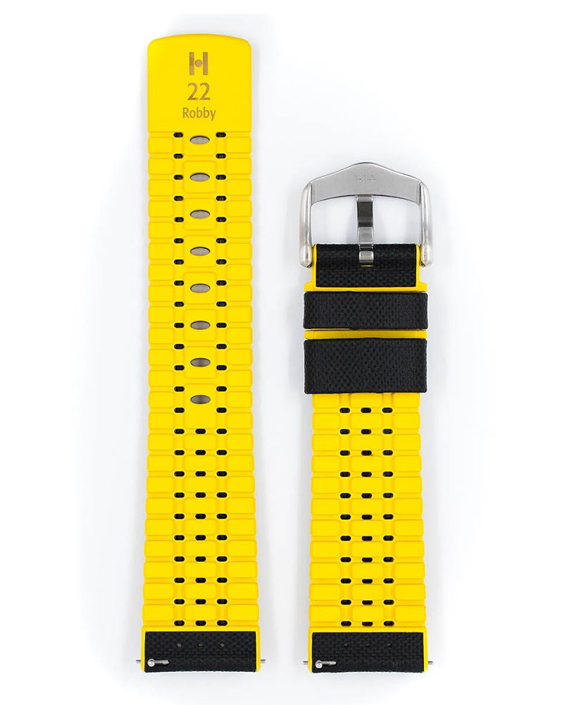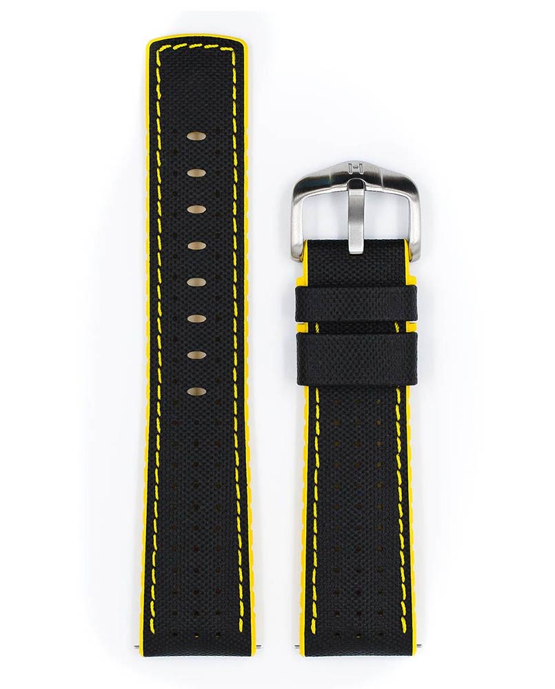 Řemínek k hodinkám, Hirsch Robby černý se žlutou gumovou spodní stranou. Funkčnost a design v dokonalé harmonii – i v těch nejdrsnějších podmínkách. Italská teletina odolná proti opotřebení s přirozeným zvrásněním a vzhledem perforované plachtoviny. Speciální struktura pryžového jádra zaručuje rychlý odvod vlhkosti a nejvyšší komfort nošení. řemínek Hirsch Robby využívá teleskopy se systémem, který poskytuje možnost rychlého nasazení a sundání pásu bez použití nářadí.